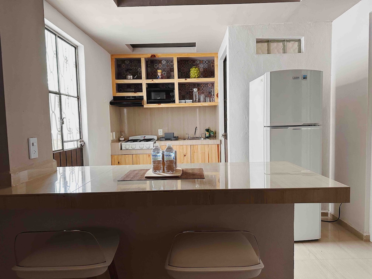 Očistite stan na tihom mestu za dva gosta (najviše tri) . Udobna viseća ležaljka s bračnim krevetom. Čajna kuhinja, opremljena minibarom,mikrotalasnom rernom, električnim šporetom, aparatom za kafu, posuđem , peglom i mašinom za sušenje veša itd. 5 minuta hoda od prodavnice Oxo. 10 minuta hoda do supermarketa „Soriana“ i 15 minuta kamionom od tržnog trga „Altabrisa“.