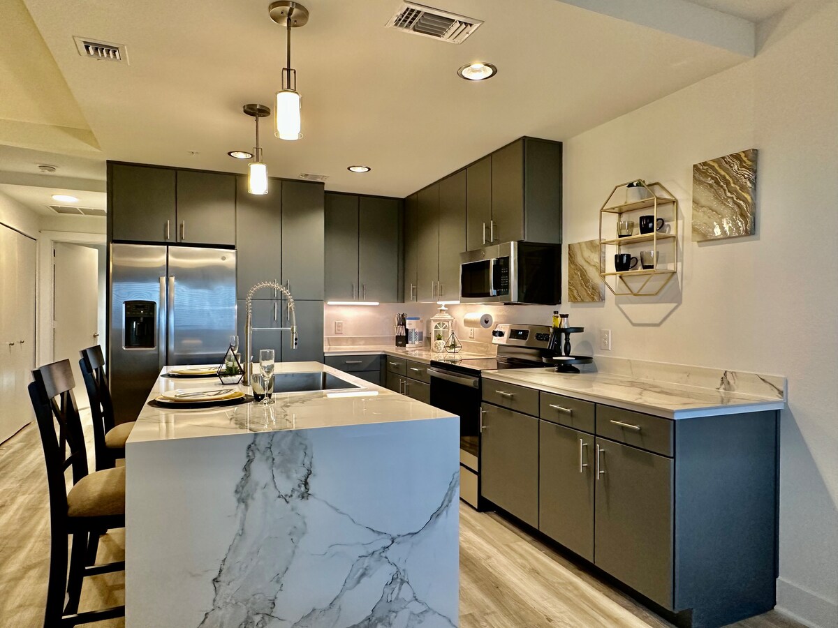 You can stop your search now. You just found the perfect place to book for your trip to San Antonio. ➹ Clean. Robust Amenities. Modern Finishes. Quick Host Responses. ➹ You're going to be located at the CENTER of everything in Downtown San Antonio. ➹ Get a good night's sleep with our memory foam beds. ➹ Spend your daytime working from home at our private home office. Cook a meal for your group in our beautiful, timeless kitchen. Then spend your evenings relaxing with our 65" Smart TV.