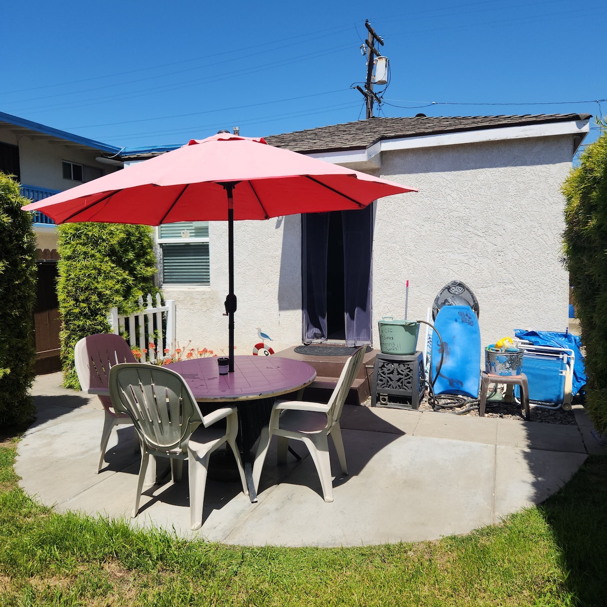 ODLIČNO ZA STAYCATIONS, RAD NA DALJINU, ODMOR, ALI BEZ ZABAVA. Prelijepa seoska kuća s 1 krevetom i 1 kupatilom koja se nalazi samo 5 BLOKOVA OD PLAŽE TH. Bračni krevet (širine 150-179 cm) u spavaćoj sobi i kauč na razvlačenje u Kuhinja je potpuno opremljena i uključuje frižider sa ledomatom. Kupatilo: tuš kabina i osnovne toaletne potrepštine. Mnogo sadržaja: spoljni tuš, daske za surfovanje, stolice/peškiri za plažu, pakovanje i igra, roštilj, ognjište i još mnogo toga. Parking u garaži je uključen.