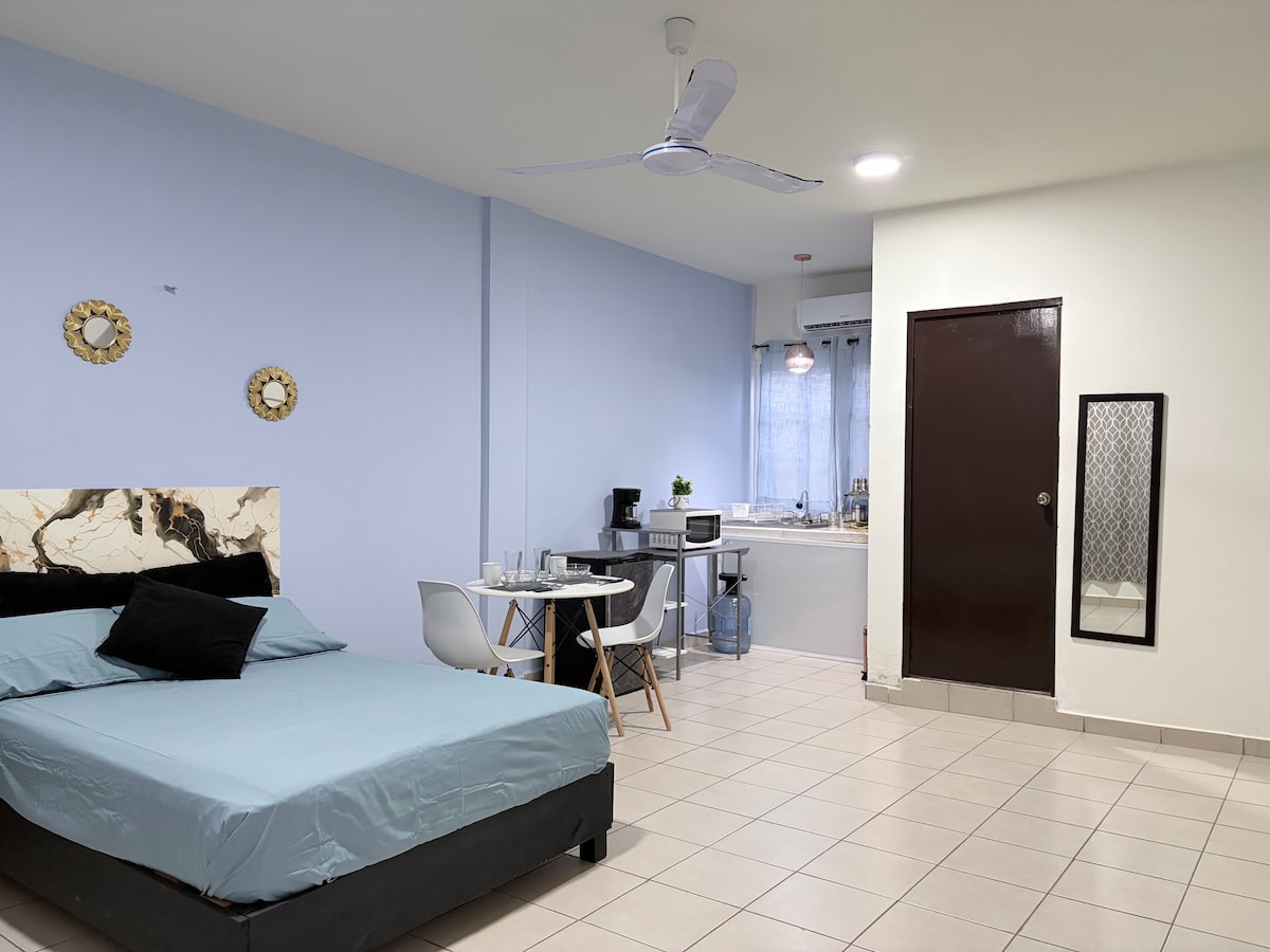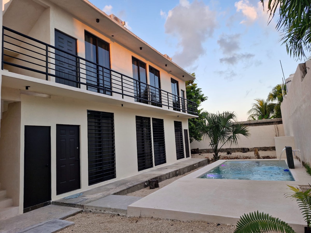 Prelijepo potkrovlje u malom kompleksu u mirnom i lijepom području. Smještaj za parove (dvije osobe). Bazen je veliki, čist i uvijek dostupan. Odlična lokacija: Aerodrom i voz Maja 5 minuta automobilom; možete prošetati do terminala Ado i trga Plaza de las Américas, gdje bezbjedni i jeftini taksiji odlaze za Bacalar. U blizini se nalazi park i mnogo restorana brze hrane, tipična hrana i još mnogo opcija.