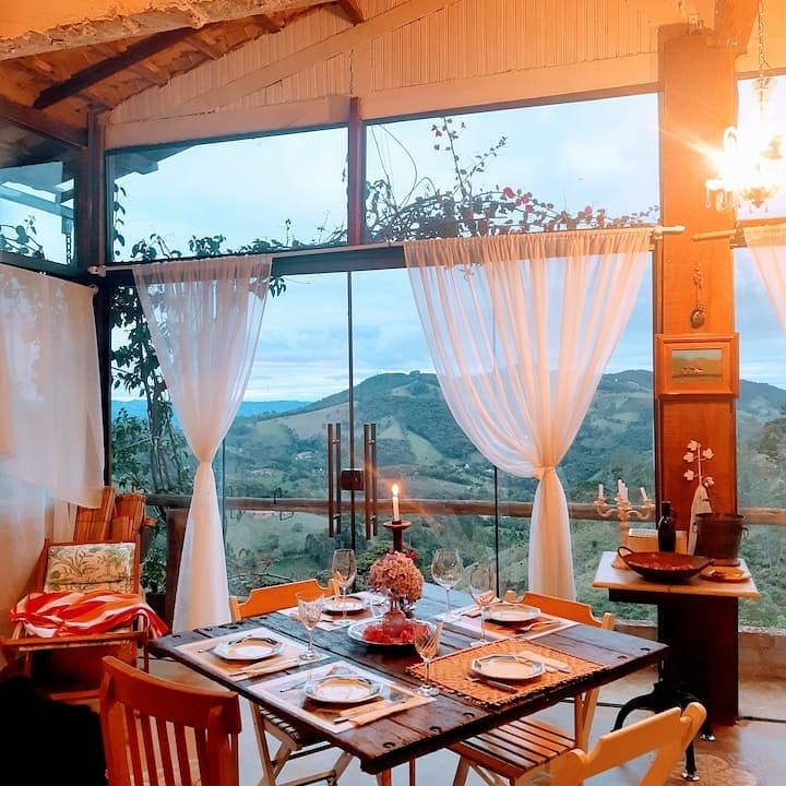 Vrlo udobna brvnara sa neverovatnim pogledom na planinu Mantikira. Idealno mesto za uživanje u samo paru ili porodici u klimi mira i harmonije sa prirodom . Odlično za one koji vole prirodu i žele da uživaju u vinu, sirevima, fondiju, kuvaju , imaju lomaču i uživaju u našoj privatnoj hidromasažnoj kadi sa neverovatnim pogledom. Ova divna planinska kuća se nalazi u Kordrego do Bomus (Sul de MG), 160 km od SP-a, relativno blizu Monte Verdea i Gonçalvesa.