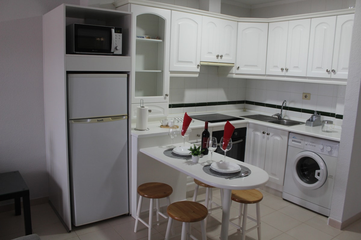 Ljupki potpuno novi apartament , Wi-Fi ,veliki zajednički bazen, udaljen 300 metara od okeana,nalazi se u mirnom delu grada Kosta del Silencio u blizini aerodroma i 10 minuta vožnje do aerodroma i 10 minuta do las Amerika. Tu su bračni krevet i kauč na razvlačenje. Stan može da primi 2 odrasle osobe,postoji frižider Televizor,zamrzivač,mikrotalasna rerna Mašina za veš,pegla i fen za kosu, postoji besplatan parking na ulici,U Kosta del Silencio možete da pronađete raj pod vodom, ronjenje sa maskom i disaljkom