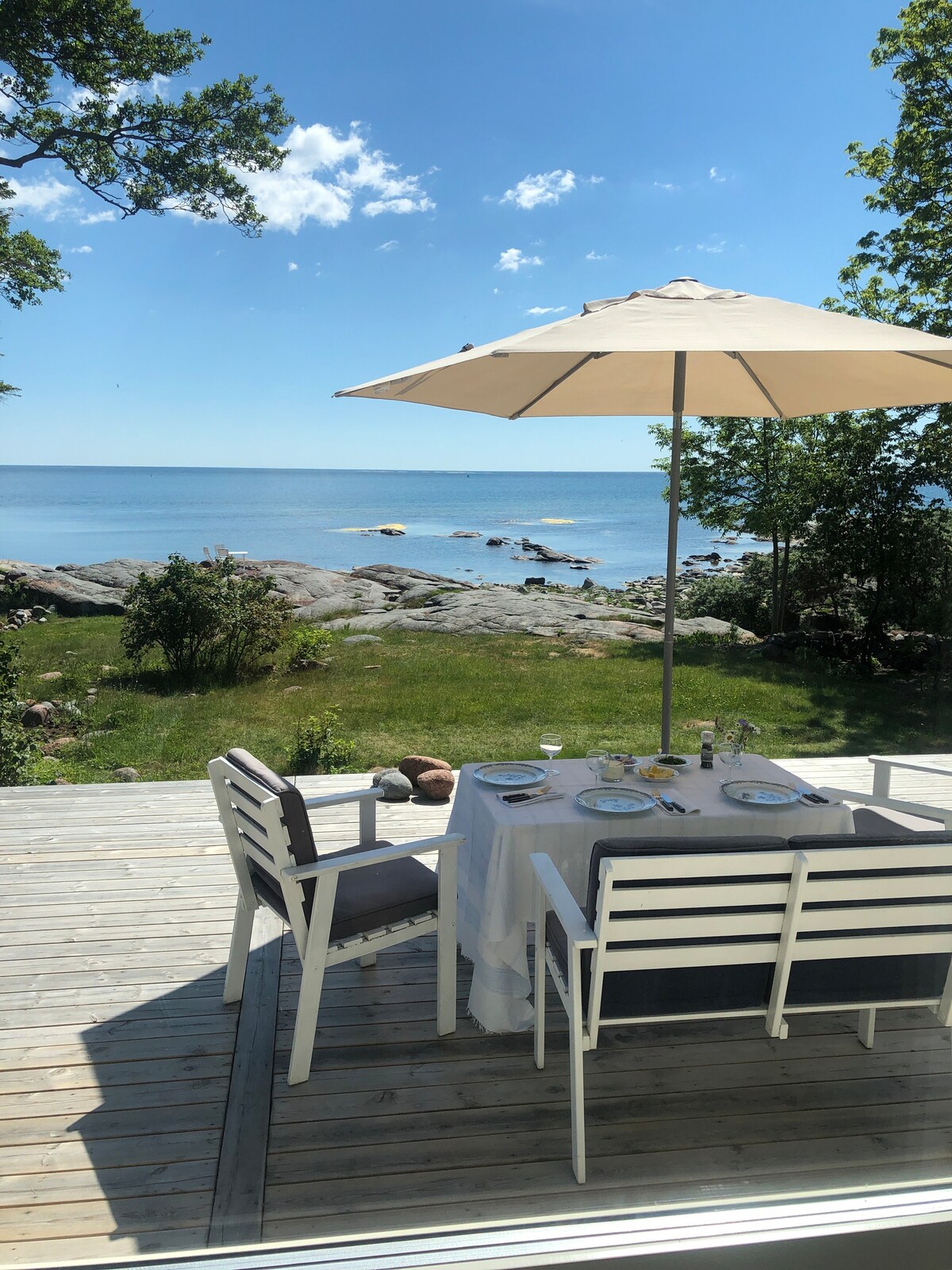 Privatna uvala. 200 m do privatne plaže. Sauna na drva. 10 kreveta u tri objekta – bez komšija na vidiku. Na parceli od 30.000 m², travnjak od 5.000 m² proteže se do vaše sopstvene pješčane plaže. Terasa od 150 m² ima prostore za objedovanje okrenute u nekoliko pravaca – doručak na jutarnjem suncu, večera na večernjem svjetlu. Privatno pristanište, tri čamca na vesla, teren za disk golf, sauna na drva, roštilj marke Weber sa ražnjem i električna pušnica za današnji ulov. Brzi Wi-Fi preko optičke mreže. Kućni ljubimci su dobrodošli.