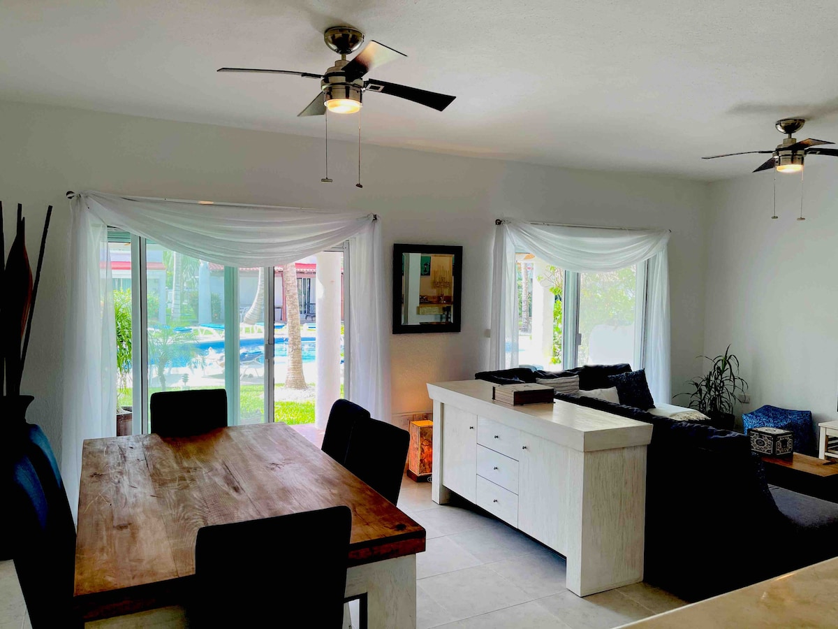 Pobjegnite u naš luksuzni dvosobni apartman u srcu Kozumela! Sa zapanjujućim terasama, modernim dnevnim boravkom i visokokvalitetnim sadržajima, ovaj stan je savršeno mesto za opuštanje i uživanje u miru ostrva. Opustite se ispred televizora sa ravnim ekranom, večerajte za elegantnim stolom za šest osoba ili pripremite sopstvene obroke u potpuno opremljenoj kuhinji. Naše udobne spavaće sobe imaju bračne krevete, privatne terase i luksuznu posteljinu za miran noćni san.