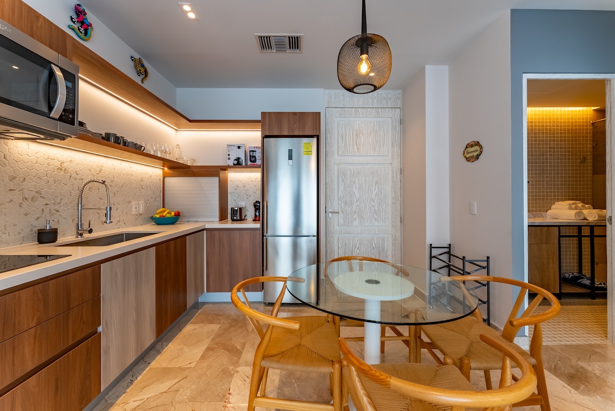 Pobjegnite u naš luksuzni dvosobni apartman u srcu Kozumela! Sa zapanjujućim terasama, modernim dnevnim boravkom i visokokvalitetnim sadržajima, ovaj stan je savršeno mesto za opuštanje i uživanje u miru ostrva. Opustite se ispred televizora sa ravnim ekranom, večerajte za elegantnim stolom za šest osoba ili pripremite sopstvene obroke u potpuno opremljenoj kuhinji. Naše udobne spavaće sobe imaju bračne krevete, privatne terase i luksuznu posteljinu za miran noćni san.