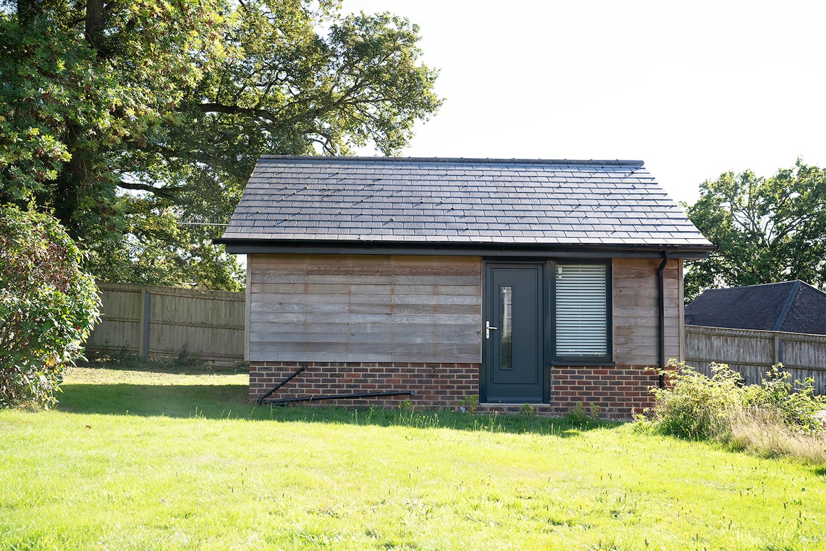 A Lovely cedar wood shingle studio with privacy in a beautiful garden full of bird song, and views to Pentridge hill. The studio has a very comfortable double bed, a sofa and wood burning stove for warmth and cosiness. There is an oval table to sit, eat or work at, surrounded by windows letting the sunlight stream in. The kitchen has is a small cooker and fridge and the basics for simple good cooking. The bathroom has a shower with plenty of hot water.