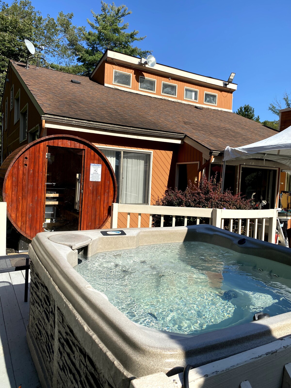 Vrlo privatni glamping šator u potrazi za Kerhonksonom. Uživajte u zvucima žubora potoka. Plivajte u svom privatnom jezeru. Pješačite na 36 hektara netaknute stare šume. Uživajte u večeri na raznim lokalnim lokacijama, Arovudu, Milu i Majni i još mnogo toga. Posjetite lokalne gradove kao što su Vudstok, Nju Palc, Elenvil i Phonesija. Vaš šator je opremljen sa dva bračna kreveta za 4 osobe. Uključena je propanska grijalica koja će vas grijati. Kuhinjski pribor, roštilj na plin i ognjište su uključeni.