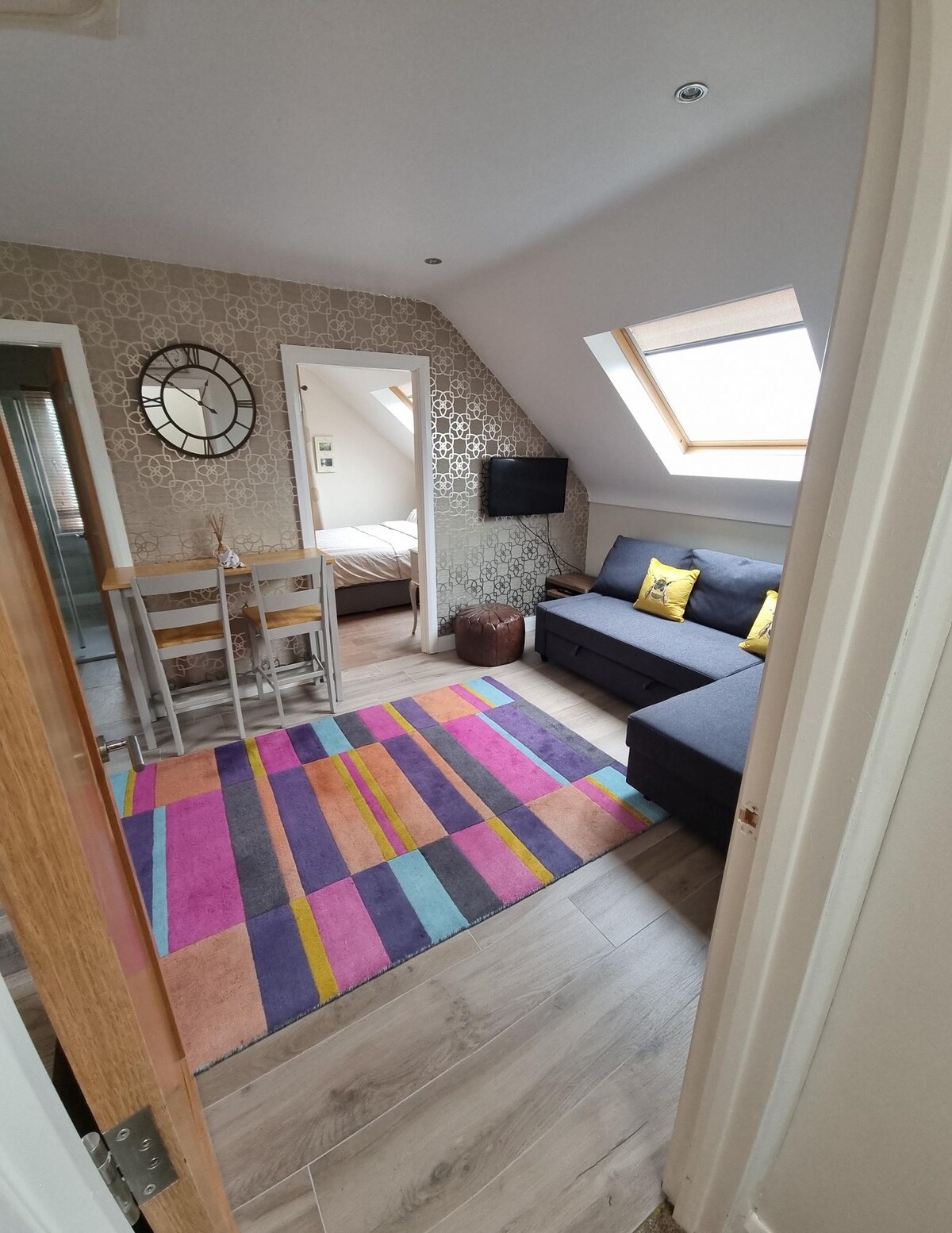 Ukusno uređen stan na najvišem spratu viktorijanske kuće u zelenom predgrađu istočnog Belfasta. Sastoji se od spavaće sobe sa bračnim krevetom, kuhinje/dnevnog boravka otvorenog tipa sa kaučem na razvlačenje i kupatila. Gosti imaju pristup dvorištu i bašti, a parking je dostupan. Samo 10 minuta autobusom do centra grada (najbliža stanica je udaljena 2 minuta hoda) i 5 minuta vožnje od gradskog aerodroma. Kratka šetnja do mnogih odličnih restorana, kafića i barova. Pogodno za Stormont Estate i biciklističku zelenu stazu.