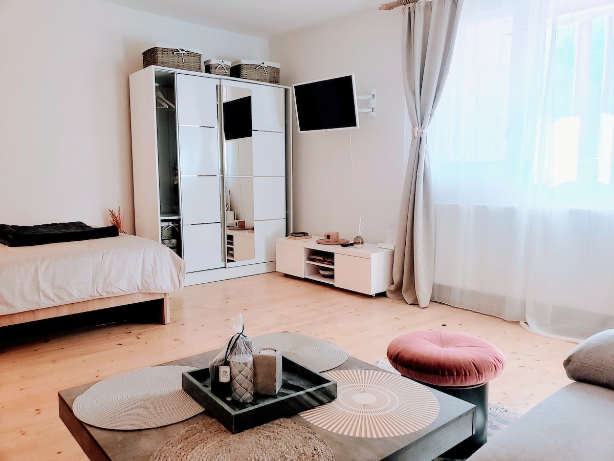 Svijetli jednosobni stan s pogledom na mirno unutrašnje dvorište u stambenoj zoni koja se nalazi u centru grada i dočekuje goste koji putuju poslovno ili sa porodicom. Prodavnice i pijaca prekoputa i u centru grada udaljeni su 10 minuta hoda.