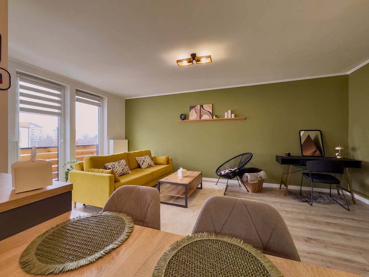 Prostrani stan sa velikom spavaćom sobom (krevet-180x200) i velikodušnim dnevnim boravkom otvorenog prostora koji se nalazi u novom stambenom području, sa privatnim parkingom, potpuno zaštićen od gradske buke i istovremeno se nalazi samo 5 minuta vožnje od centra grada. Savršeno mjesto za porodice sa djecom, parove ili pojedinačne putnike koji takođe mogu da uživaju u namjenskom prostoru za rad na daljinu.