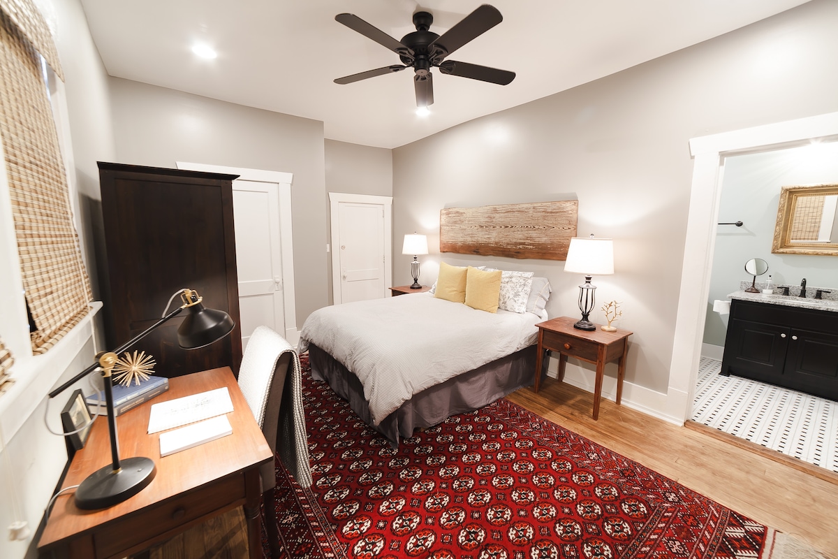 Divan stan u centru grada. Novi drveni podovi u dnevnom boravku! Pješačka udaljenost do sadržaja i atrakcija, uključujući rafting i noćni život na bijeloj vodi i samo 8 do 10 minuta od Fort Beninga. Prelepo ograđeno dvorište! Smeštena odmah iza našeg istorijskog ličnog doma, ova zgrada je bila prvobitni dom porodičnih kočija kada se nije koristila. Imamo više od300 Wi-Fi, mašinu za pranje i sušenje veša, kao i šampon i regenerator za vaše prvo noćenje