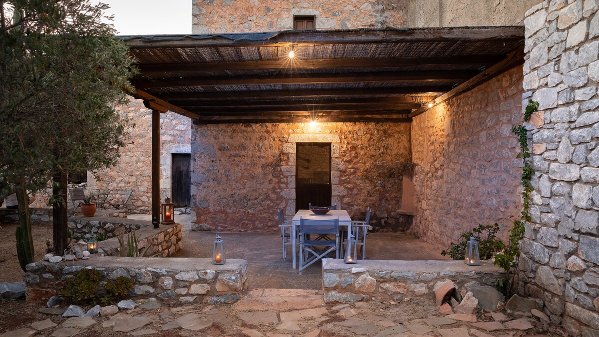 Smeštena u neobičnom selu tradicionalnih kamenih kula u istočnom Maniju (lokacija filma Džona Kasavetsa „Najpoznatija“), ova kuća na obronku brda ima pogled tipičan za Mani, gledajući na masline i more koje je udaljeno samo 5 minuta vožnje.