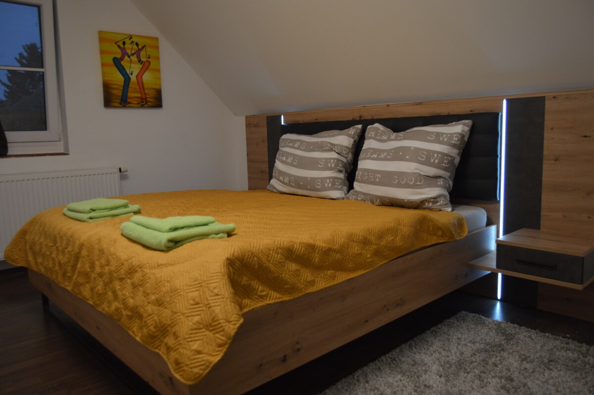 Želimo da vam ponudimo jedinstven smještaj u Jiřetín pod Jedlovou u maloj porodičnoj gostinjskoj kući Rustik. Elegantan i prostran stan De Luxe (57 m2) kapaciteta do 5 osoba opremljen je kuhinjom, kupatilom i dnevnim boravkom. Radi lakšeg snalaženja, možete koristiti baštu, igralište ili hidromasažnu kadu u bašti. Kućni ljubimci su besplatni i dobrodošli. Takođe nudimo mogućnost doručka po dogovoru. Parking odmah pored objekta. Kada koristite druge stanove, kapacitet gostinjske kuće Rustic House je do 9 osoba.