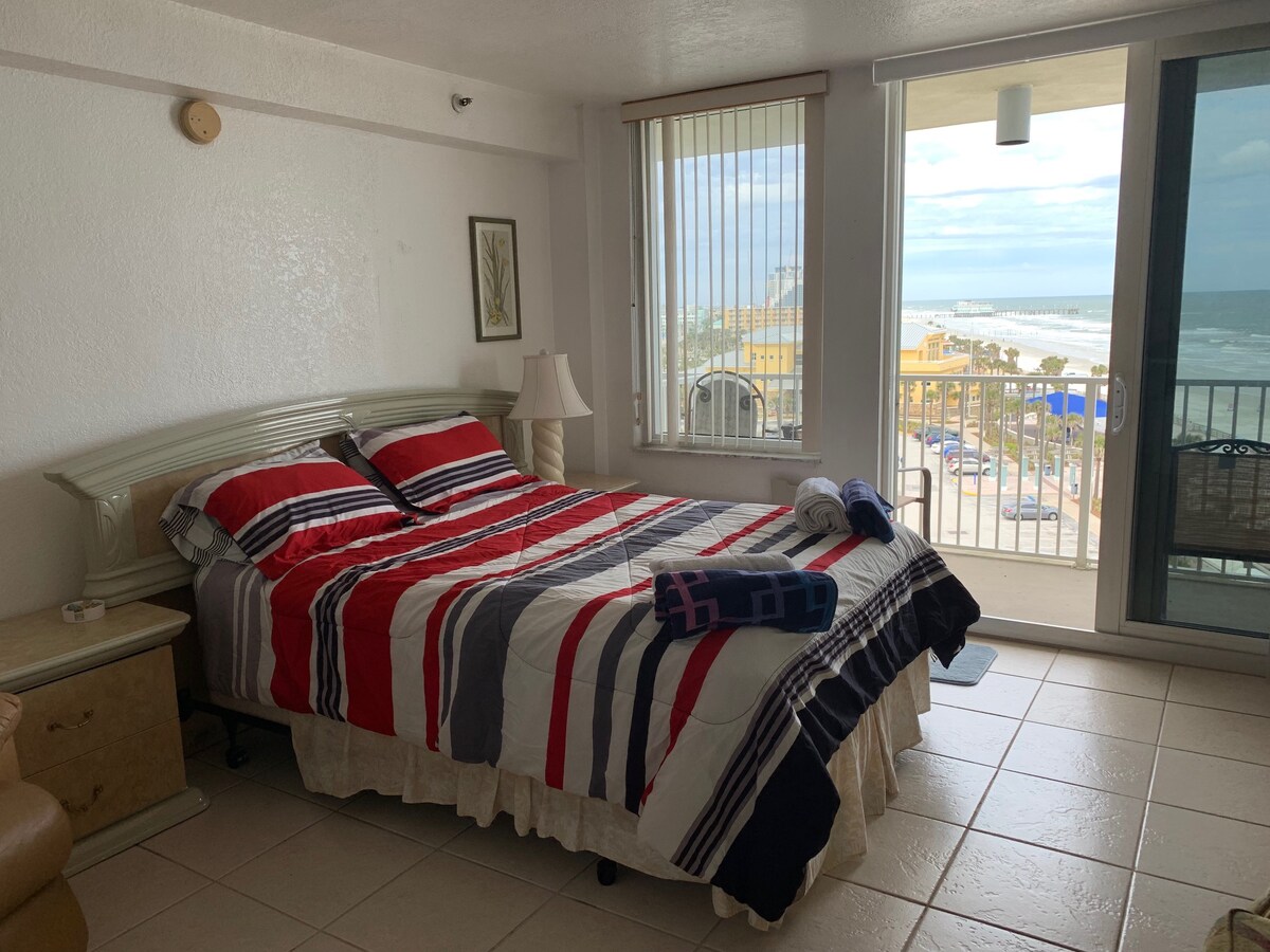 Predivan studio apartman sa pogledom na okean samo nekoliko koraka od čuvene plaže na svetu. Kondominijum se nalazi u odmaralištu ispred plaže. Poslušajte zvuk okeana na privatnom balkonu. Studio apartman Dejtona Bič sa prelepim pogledom na okean u Dejtona Biču nudi smeštaj, bazen na otvorenom, hidromasažnu kadu, fitnes centar, sve američki restoran i tiki bar sa DJ-om uživo. Besplatan Wi-Fi i privatni parking.