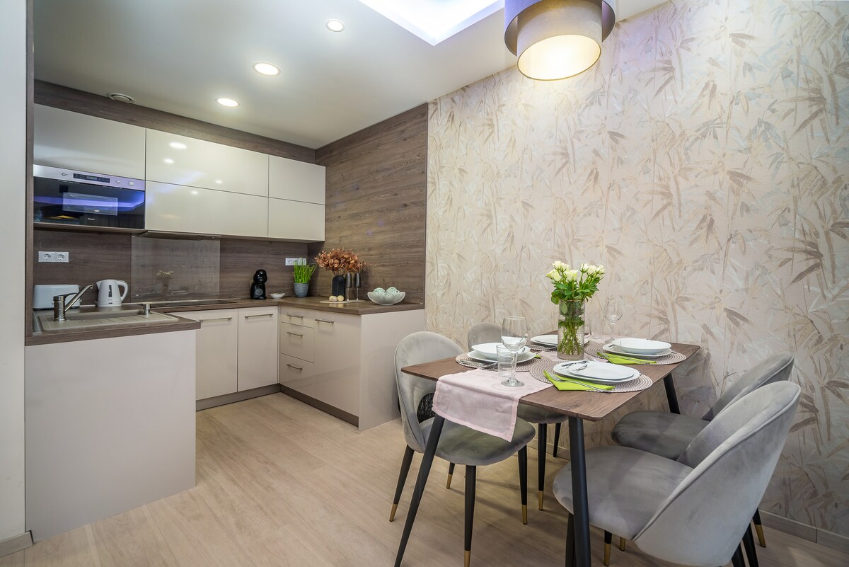 Luksuzni stan od 43 m2 sa modernim namještajem i balkonom. Stan ima 1 spavaću sobu, kombinovanu trpezariju i dnevni boravak, dobro opremljenu kuhinju i kupatilo sa tušem. Spavaća soba ima bračni krevet. Kuhinja je opremljena svim elektronskim uređajima kao što su rerna, ploča za kuvanje (ploča za kuvanje), aparat za kafu, mikrotalasna pećnica, frižider, mašina za pranje sudova, a tu je čak i mašina za pranje veša.