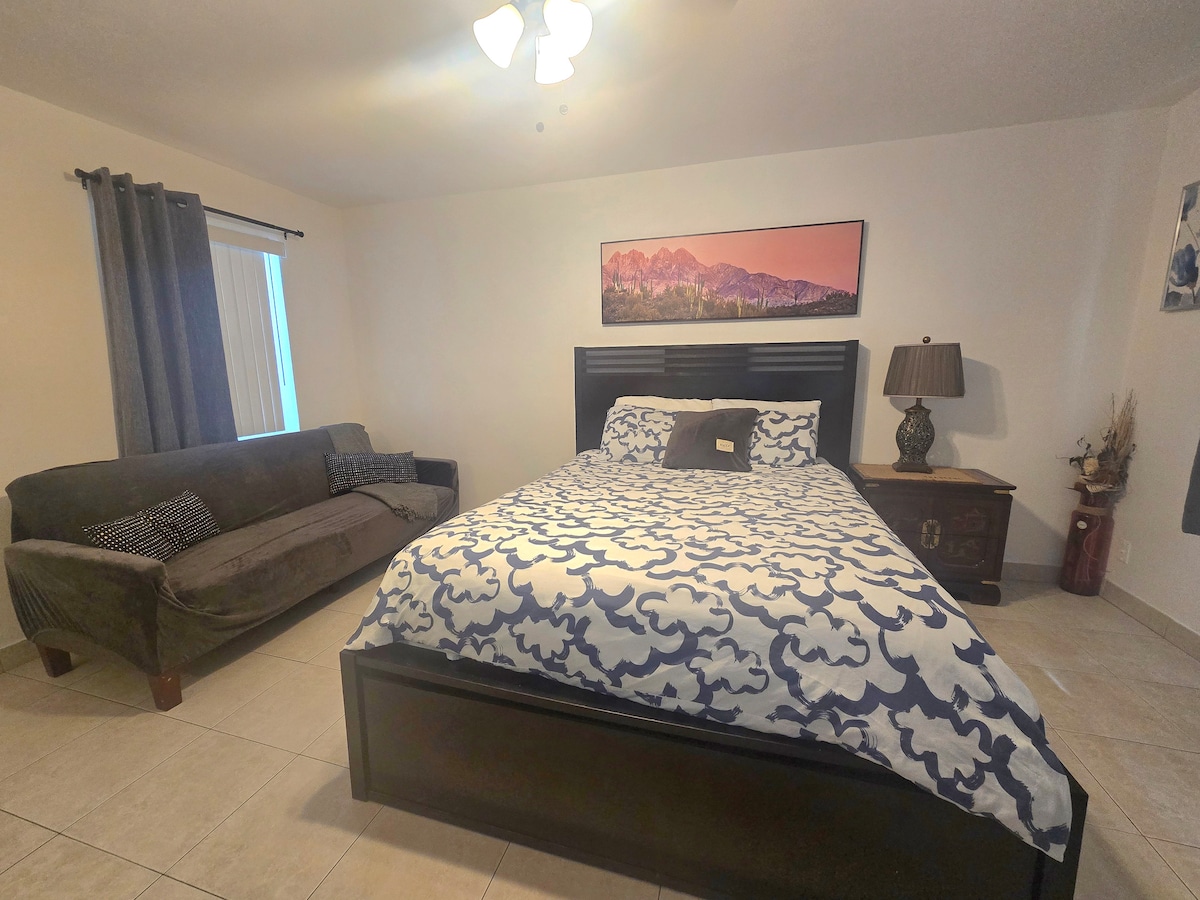 Udoban privatni studio za 2 osobe. 1 bračni krevet. kompletna kuhinja. šporet, rerna.sto za 3 osobe sa stolicama, frižider. Zavese koje potpuno zamračuju prostoriju. Pametni TV sa aplikacijama. Dva ormara jedan pored drugog. Mali komoda sa 3 fioke. Tuš u kupatilu. Topla voda. Pristup bazenu. Stolovi za piknik i suncobrani napolju da biste uživali u floridskom suncu. Perionica veša u sklopu objekta * mašina na kovanice) besplatan parking ispred. Holivud Bič je udaljen 9 minuta. Holand park je udaljen 5 minuta. aerodrom je udaljen 12 minuta.