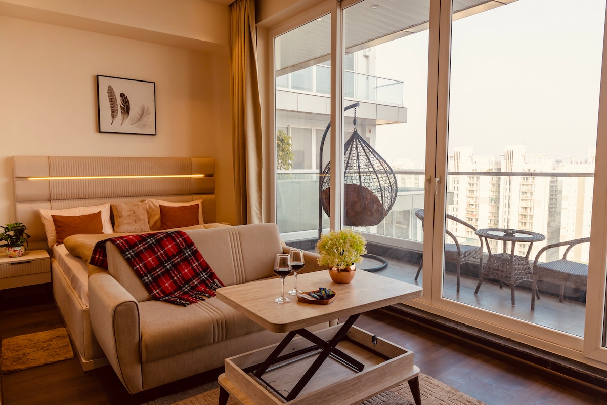 Welcome to Aurelia Luxe, your serene escape on Golf Course Extension Road, Gurgaon. Warm tones, soft textures, and a private balcony create a soothing retreat, designed for families, solo travelers, and couples seeking the perfect blend of comfort and elegance. Guests also enjoy access to building amenities including a swimming pool and gym Indulge in nearby dining spots, and enjoy the convenience of hassle-free connectivity via the Sector 55-56 Gurgaon rapid metro and Huda City Centre metro