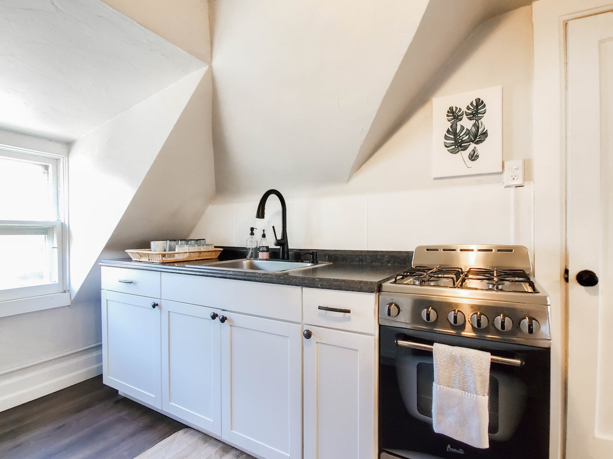 Bez NAKNADE ZA ČIŠĆENJE! Započnite dan u velikoj popločanoj tuš-kabini, a zatim pratite imejlove na praktičnom radnom stolu. Ovaj dom otkriva pažljivo planiranje za dvoje, koji prikazuje dizajnersku čajnu kuhinju, mašinu za pranje/sušenje veša, pametni TV sa kablovskom, radni sto/radni prostor i super brzi Wi-Fi. Imaćete svoj privatni ulaz u ovaj potpuno renovirani stan. Blizu smo svega: prodavnica brendova Whole Foods odmah iza ugla, restorani, barovi i Cheesman Park su blizu. Besplatan parking na ulici.