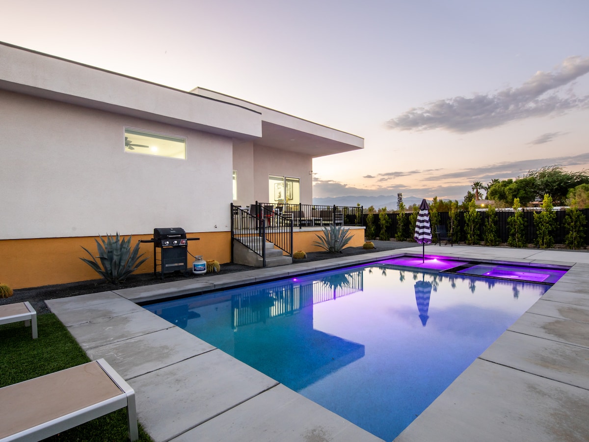 Dobro došli u Mountain View Retreat u Desert Hot Springsu gdje možete uživati u prekrasnom panoramskom pogledu na planine iz dvorišta, uživati u suncu dok ste u bazenu/hidromasažnoj kadi sa slanom vodom, uživajte u igranju igara na otvorenom i gledanju omiljenog filma na ekranu projektora na naduvavanju. Ova kupatilo sa 3 kreveta i dnevnim boravkom/kuhinjom/kuhinjom/trpezarijom otvorenog koncepta je odlično mesto za opuštanje nakon golfa 18 rupa na obližnjem terenu za golf ili za vikend odmor sa porodicom ili prijateljima.