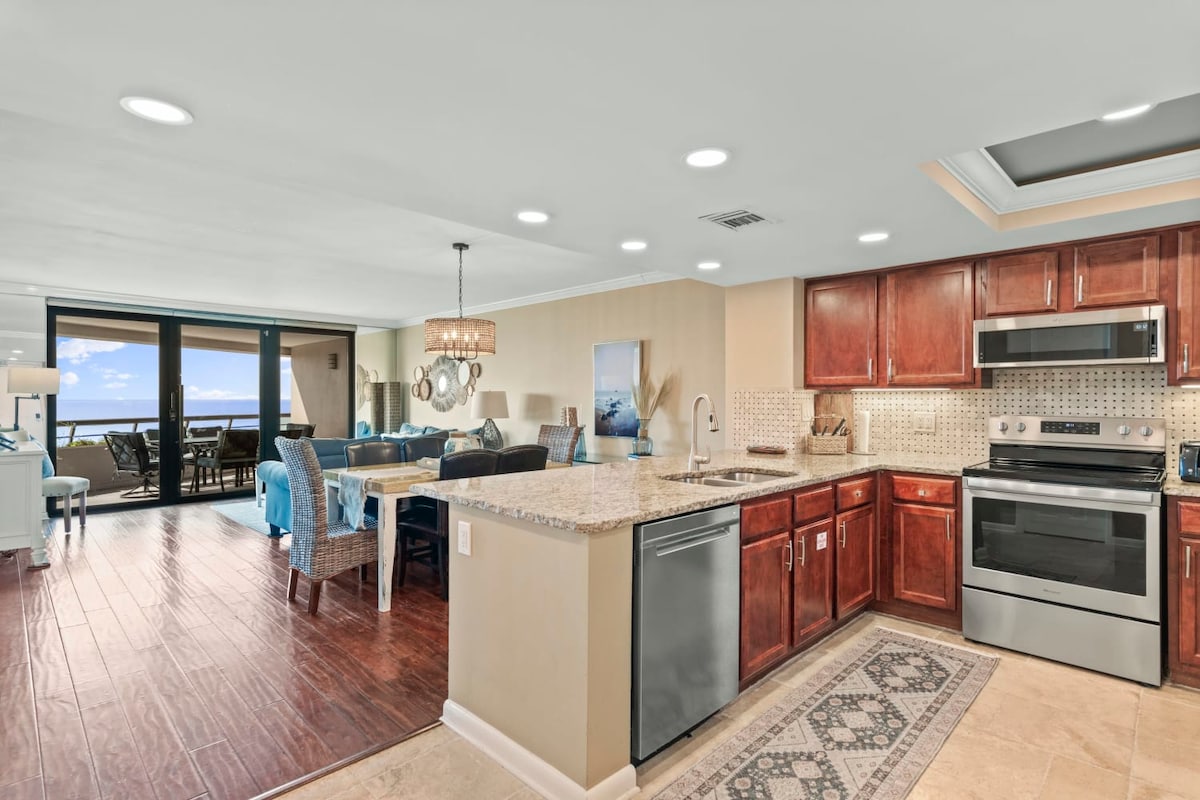 Potpuno renoviran stan na 8. spratu na samoj plaži sa neometanim pogledom na zaliv i plažu. Smješten u srcu Destina u popularnom odmaralištu Pelikan Bič, uživaćete na privatnoj plaži, više spoljnih bazena, unutrašnjem bazenu, hidromasažnoj kadi i još mnogo toga. Naš stan uz plažu je profesionalno renoviran sa potpuno novim ormarićima, klima-uređajem, podovima, uređajima, nameštajem, kuhinjom i još mnogo toga. Svi dušeci su potpuno nova, cool-gel memorijska pena za hladan san. Potpuno složena kuhinja.