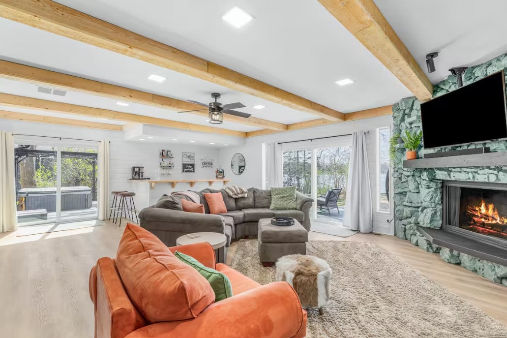 Ovaj veliki smještaj savršen za grupe jedinstveno je dizajniran sa ugrađenim centrom za odmor! Doživite saunu, hidromasažnu kadu, salon, zvučni sistem Sonos, kameni tuš sa vodopadom za spa doživljaje, četiri kupatila, trpezariju ili konferencijski sto za 12 osoba, dva unutrašnja kamina, dovoljno parkinga, ugrađeni bar, dasku za miješanje, spoljašnje dvorište okruženo drvećem i divljim životinjama, roštilj i opcionalni spa doživljaj, uključujući ogrtače, japanke i dodatne peškire.