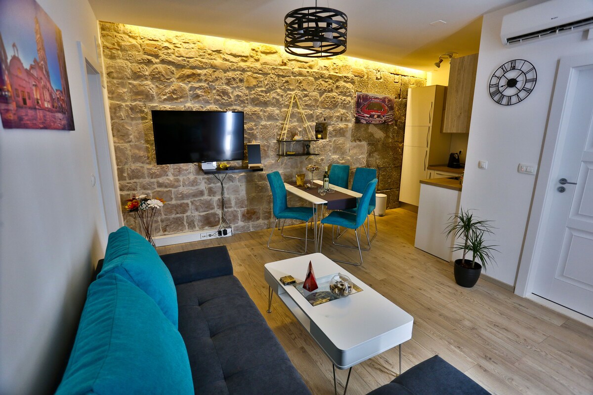 Stan na drugom spratu novoobnovljene kuće stare 600 godina. Nalazi se 200 metara od Zlatne kapije (glavni ulaz u drevni rimski palat). Možete da prošetate do najbližeg beachea u trajanju od 15 minuta, a možete i autobusom. Čuveni park - šuma Marjan je takođe u blizini. Ima više nego dovoljno restorana i barova udaljenih ni minut ili dva! Ako tražite dobar provod ili malo mira i tišine, ovde ćete sigurno naći oboje!