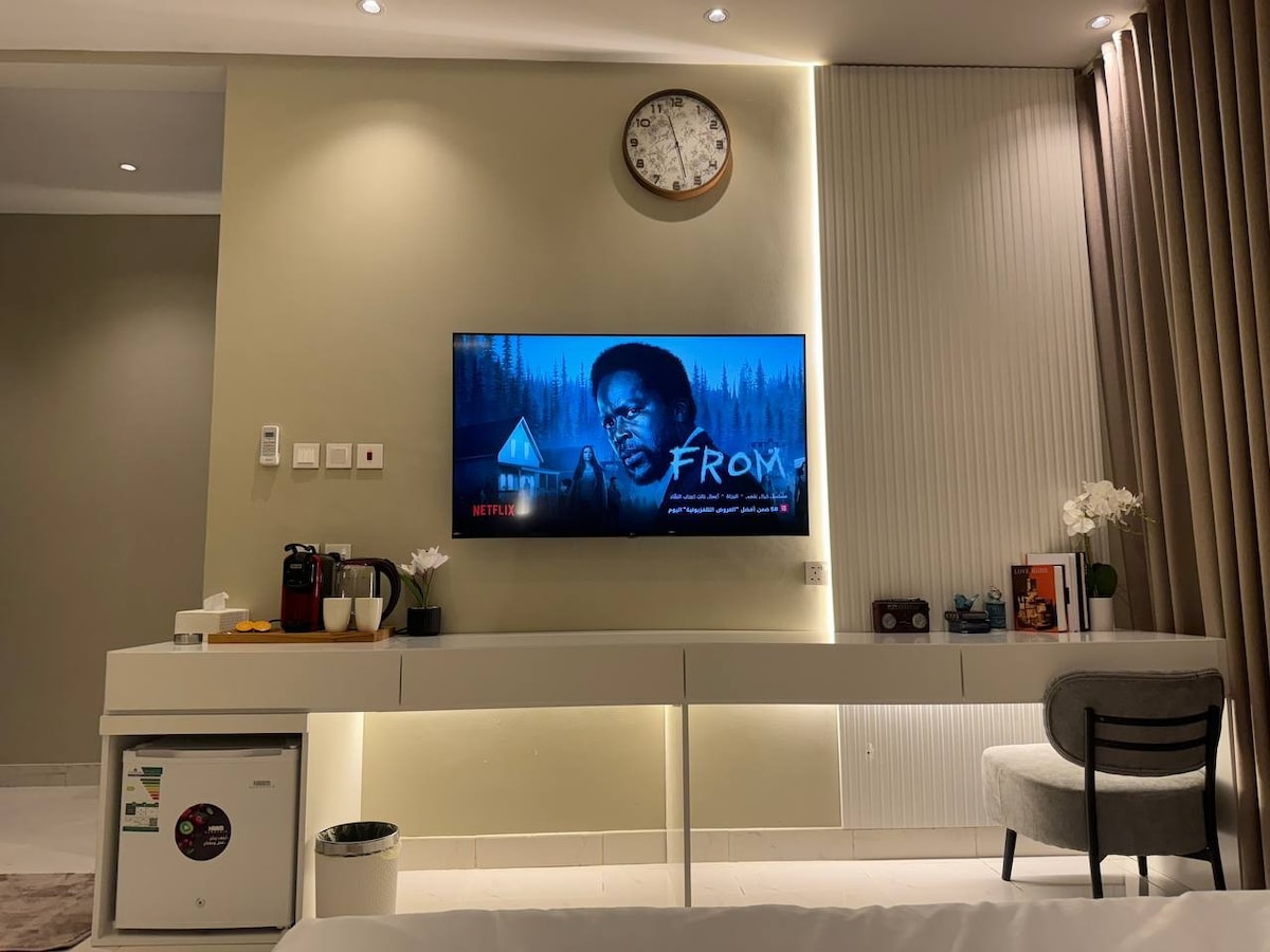 Luksuzni studio apartman koji se sastoji od spavaće sobe, kuhinje i potpuno opremljenog kupatila (šampon, papuče, jednokratni peškiri, maramice). • Pored Bulevara u Hittinu, Sjeverni Rijad... Lokacija je idealna, u blizini glavnih događaja kao što su sezona u Rijadu, Dirija i sve osnovne usluge kao što su restorani i kupovina. Konkretno: - Bulevar Siti, 6 minuta hoda -Boulevard World 7 minuta hoda Stadion Arena 9 minuta hoda
