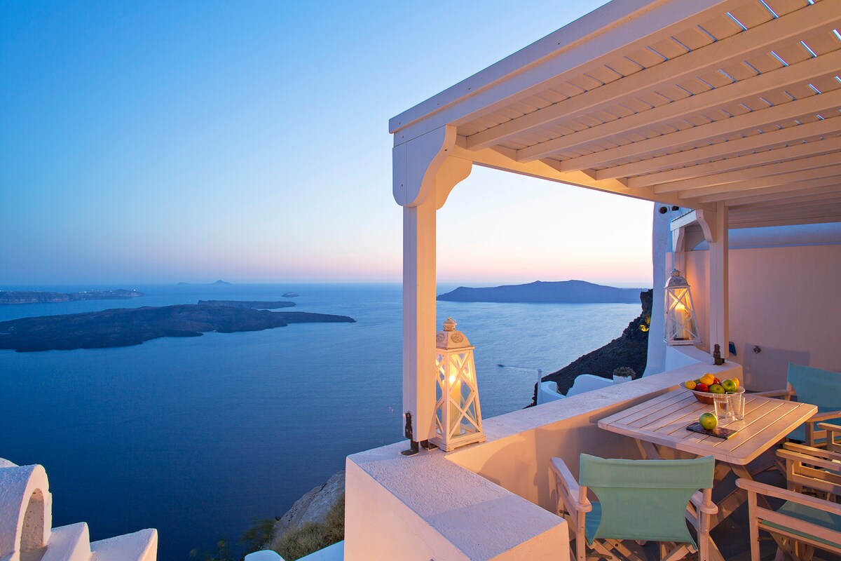 Dobro došli u Barocco Bello vilu Kuća je izgrađena u pećini u Firostefaniju, što znači „Fira kruna“. Ovo područje je jedna od najviših tačaka na Kalderi, što mu pruža neometan i veličanstven pogled na more, vulkan i veći deo Santorinija. Glavni centar grada Fira udaljen je deset minuta hoda jednim od najslikovitijih puteva ostrva. Iako tradicionalna kuća ima najmodernije sadržaje , enterijer vile ima pop barokni ukus