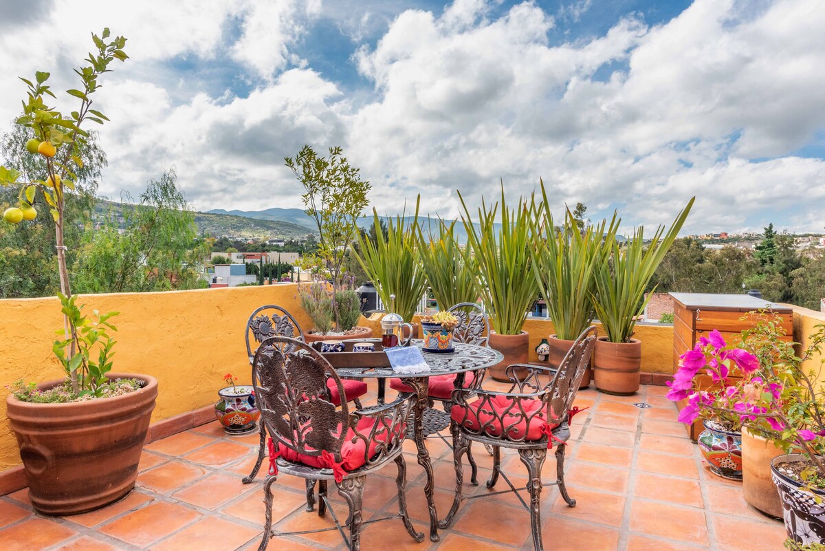 Doživite Casa de Guadalupe, šarmantnu kolonijalnu kuću u četvrti San Antonio u San Migelu. Uživajte u dvije prekrasne spavaće sobe s klima-uređajem i grijalicama, autentičnom meksičkom dekoru i predivnoj krovnoj terasi s pogledom na zalazak sunca. Prošetajte do lokalnih pekara i pijaca. Udaljen je 20 minuta hoda od Parokije, 15 minuta od parka Huarez i 10 minuta od Instituta Aljende.