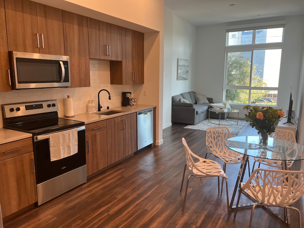 Uživajte u boravku u ovom predivnom apartmanu u srcu grada! Prostor ima prozore od poda do plafona koji prostor preplavljuju prirodnim svjetlom. Kako bi vam boravak bio što jednostavniji, stan je opremljen ulazom bez ključa, automatskim roletnama i termostatom Nest. Vaš boravak kod nas vam omogućava pristup dvije teretane, dva bazena i dva krova! Na pješačkoj udaljenosti od Whole Foods-a, mnoštva restorana i barova, kao i u blizini autoputa i metroa!