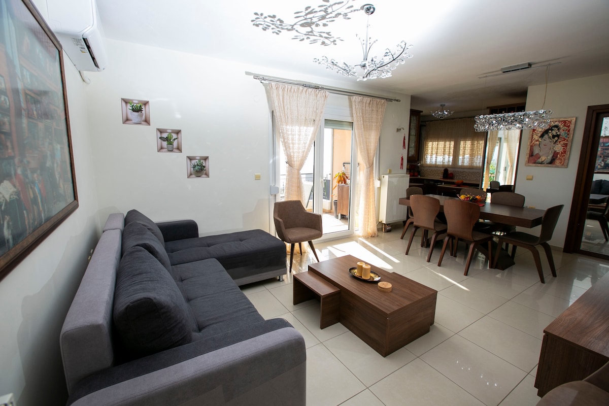 This fully furnished 3 bedroom apartment offers views of both the sea and surrounding mountains. We are located in a calm, authentic Greek neighborhood, where you’ll experience true local charm and hospitality. The apartment is fully equipped for your vacation, including a complete kitchen with cooking essentials. The beach is just a 15-minute walk downhill. We are here to make your stay as comfortable as possible — from sharing insider tips to offering help whenever needed.