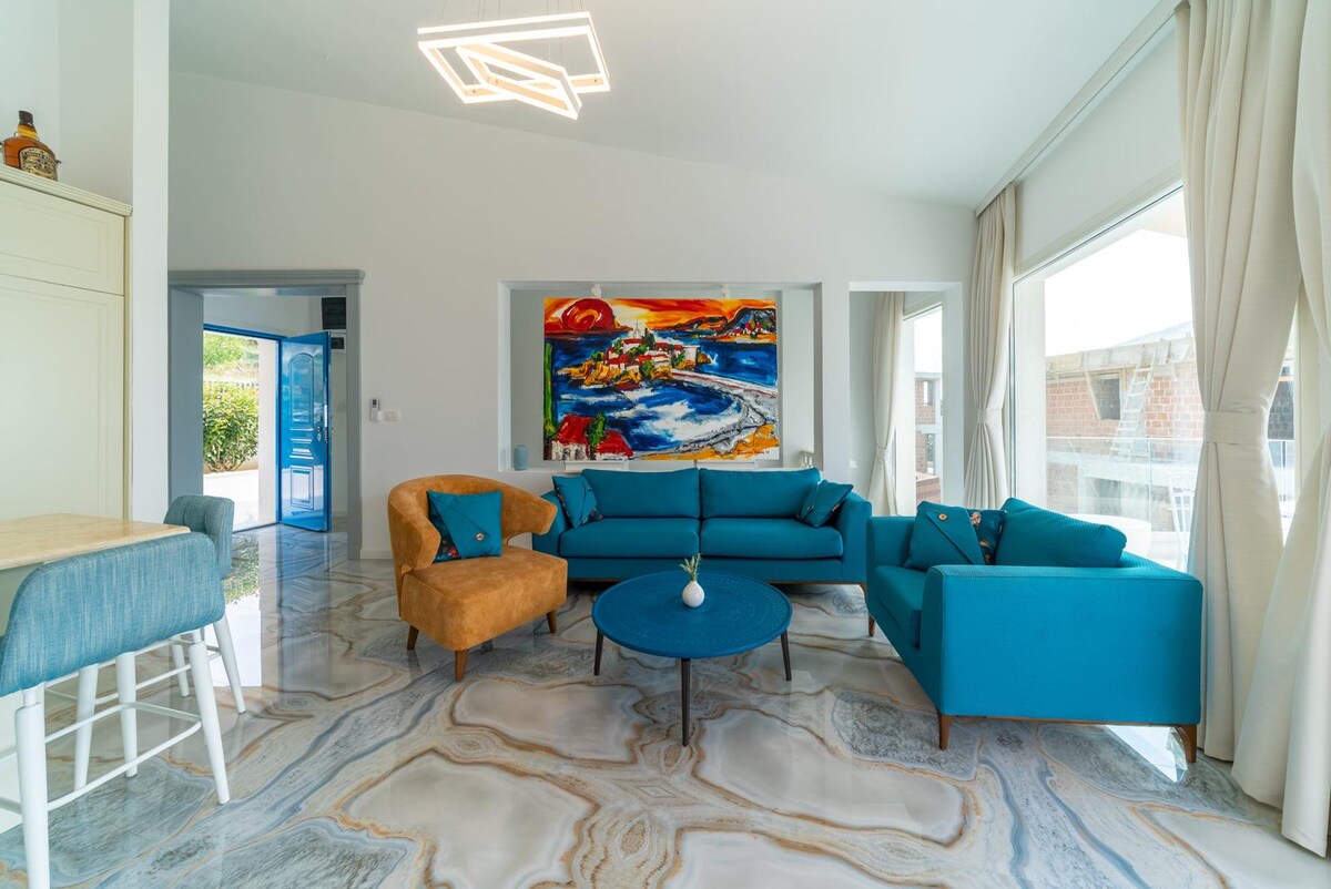 Panoramski pogled na Jadran iz ove ekološki prihvatljive tripleks kuće, koja je dio vila s bazenom Orange Tree, smještena 80 m iznad mora u prvoj liniji potpuno novog brdovitog naselja u blizini Svetog Stefana. Opustite se pored privatnog bazena, uživajte na suncu na terasi i uživajte u tišini i svježem morskom povjetarcu. Za 6 osoba u 3 spavaće sobe i 1 na sofi (50 € po noćenju). Jedan mali kućni ljubimac sa preliminarnim odobrenjem. Idealno za porodice ili prijatelje koji traže prirodu, spokoj i jednostavan pristup najboljim plažama Budvanske rivijere.