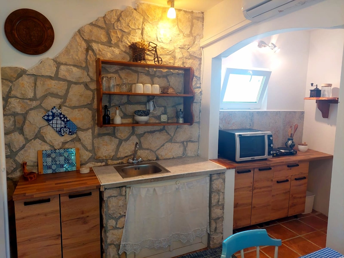 Nudimo mali udoban apartman za 3 osobe koji nudi sve što vam je potrebno za prijatan boravak. Sastoji se od opremljene kuhinje sa svim potrebnim posuđem, trpezarijskim stolom i kaučem za dnevni odmor od vrućine. Tu je i soba sa bračnim krevetom i pomoćnim ležajem, kao i kupatilo i toalet. Avanturisti, porodice, prijatelji i svi oni koji žele prelepu prirodu, nudimo udoban smeštaj i stojimo na raspolaganju za sve informacije vezane za ostrvo i kako najbolje iskoristiti vreme na njemu.