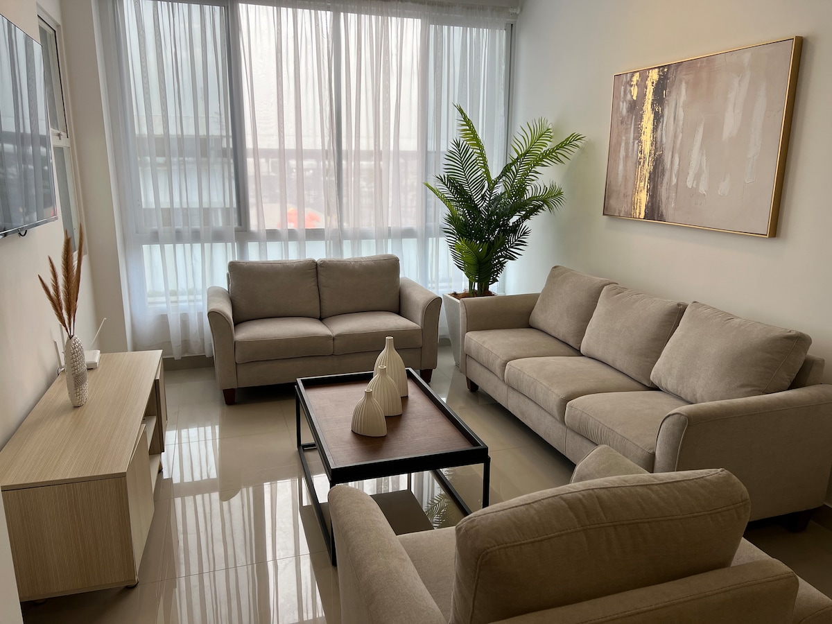 ✅ Prekrasan apartman na 8. spratu zgrade River Front #1, sa spektakularnim balkonom i panoramskim pogledom na sektor Puerto Santa Ana. 🛏️ Cama King (3 sjedišta) sa posteljinom od 100% pamuka i dvosjedom sofom na razvlačenje, idealno za uživanje u dvoje ili sa porodicom. 🍳 Opremljena kuhinja, mašina za pranje/sušenje veša, topla voda, internet, DirecTV i podzemni parking. 🏊♂️ Zgrada nudi 24/7 obezbjeđenje i sadržaje: bazen, đakuzi, saunu i teretanu. ✨ Samo 10 minuta od aerodroma.