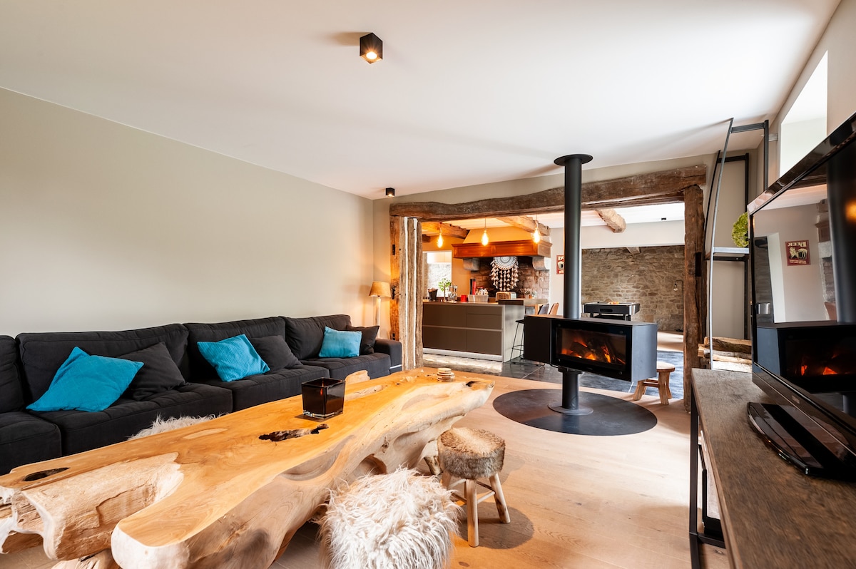 ***!! Iz poštovanja prema komšiluku, ovom smeštaju je zabranjeno za grupe koje žele da imaju bučne žurke!! ZABAVE NISU DOZVOLJENE!! Poštovanje prema kući i susjedstvu *** Topla luksuzna seoska kućica sa maksimalnim kapacitetom. 15 osoba (uključujući 2 dece zbog 1 kreveta na sprat) Sauna, bilijar, 5 toaleta. U jednom od najlepših sela u Valoniji: Verisu, na 10 minuta od centra Durbuya, Hotton i 6 minuta od Barvaux-Sur-Ourthe. Seoska kuća se nalazi na ulazu u stazu za šetnju.