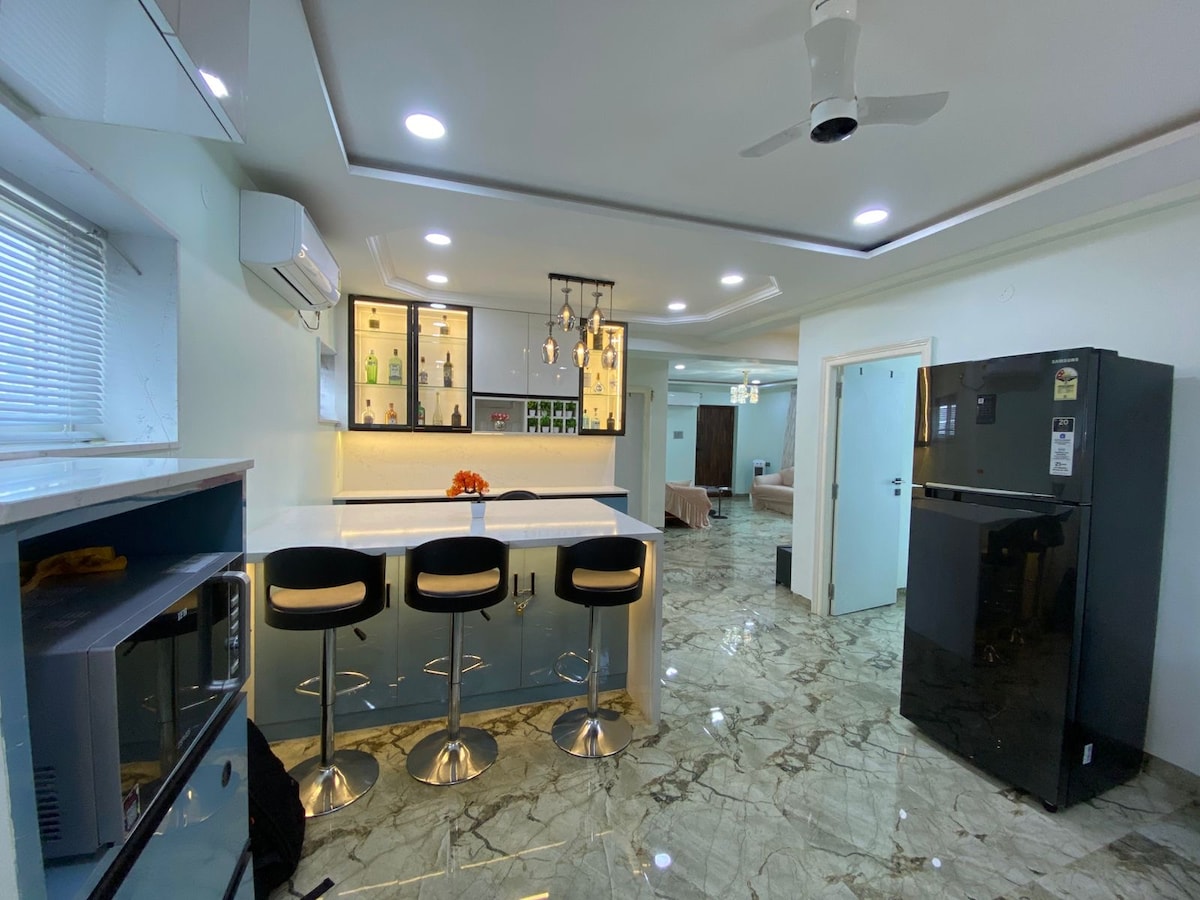 Dobro došli u naš elegantni trokrevetni apartman, idealan za kratak ili duži boravak. Uživajte u 3 spavaće sobe sa klima-uređajem i spojenim kupatilima, udobnom dnevnom sobom sa 43-inčnim pametnim TV-om, brzom Wi-Fi mrežom i unutrašnjom ljuljaškom. Potpuno opremljena kuhinja uključuje plinski šporet, mikrotalasnu pećnicu, prečišćivač vode, frižider i pribor za jelo. Pogodno se nalazi u blizini metroa Hajtek Siti, Usha Malpuri's Kitchen (100 m), US Visa Centra (1 km), kablovskog mosta i glavnih IT čvorišta.