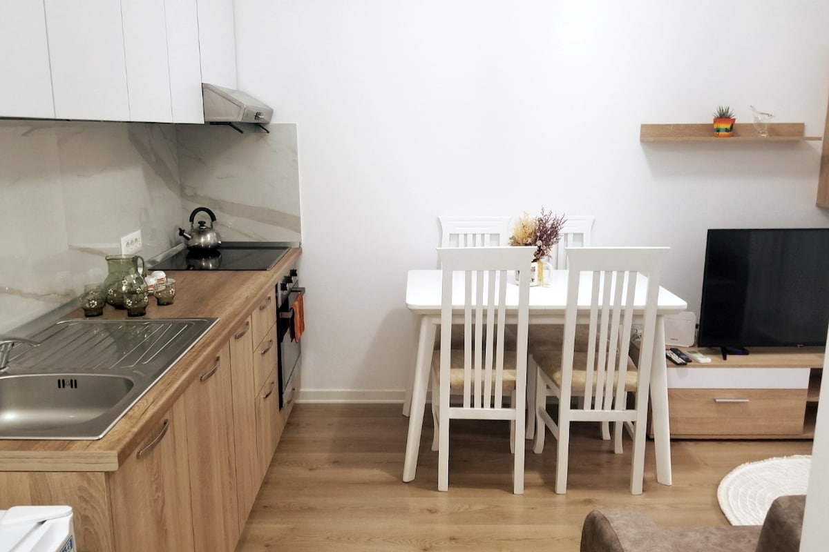 Boho-chic moderni studio dizajniran za vrhunsku udobnost i praktičnost. Sa bračnim krevetom, potpuno opremljenom kuhinjom i pametnim TV-om od 55 inča sa Netflix-om, ovaj prostor je idealan za opuštanje i produktivnost. Savršeno za osobe koje rade na daljinu, sa stabilnim, brzim internetom i lokacijom samo 200 metara od centra grada, sve što vam je potrebno je upravo ovdje.
