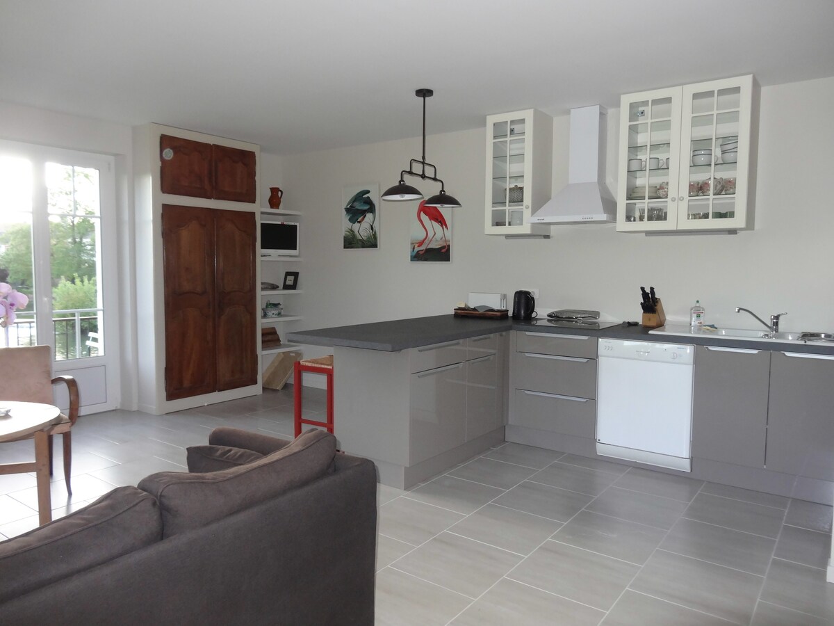 Prekrasan osunčani nezavisni smještaj od 60 m2 u staroj štali Balkon s pogledom na rijeku s jedinstvenim pogledom na dvorac Durtal, dnevni boravak s kuhinjom otvorenog tipa, šporet na drva 2 spavaće sobe ,jedna sa bračnim krevetom, prozor sa pogledom na selo ,jedna spavaća soba sa 2 kreveta 1 tuš-kabina, zasebna WC šolja Objekat je veliki, šumovit i bogato cvjetnim Na raspolaganju su vam brod, dva bicikla, ljuljaška, trampolina i kuća na drvetu.