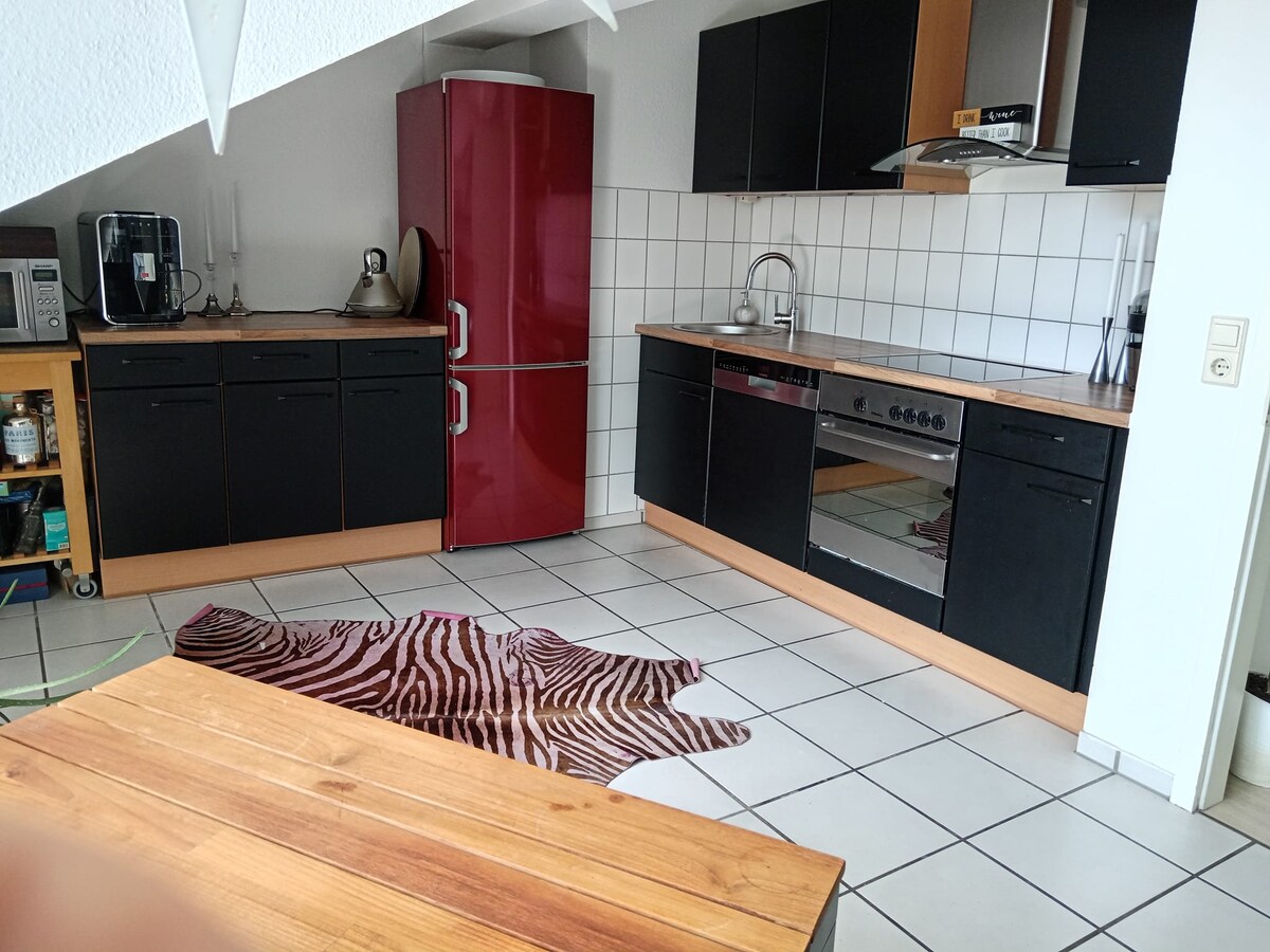Moderan stan u potkrovlju površine 72 m² u srcu Vupertala. Uživajte u pogledu na viseću prugu i planinsku panoramu. Potpuno opremljena kuhinja sa indukcionom pločom za kuvanje, elegantnim namještajem, krevetom sa oprugama dimenzija 160x200 cm za najbolju udobnost spavanja. Pametni TV, brzi Wi-Fi. Idealno za najviše 4 osobe. Uključen je besplatan parking, kafa/čaj i savjeti domaćina. Doživite odličan životni koncept uz umjetnost na centralnoj lokaciji! Savršena kombinacija modernosti i udobnosti.