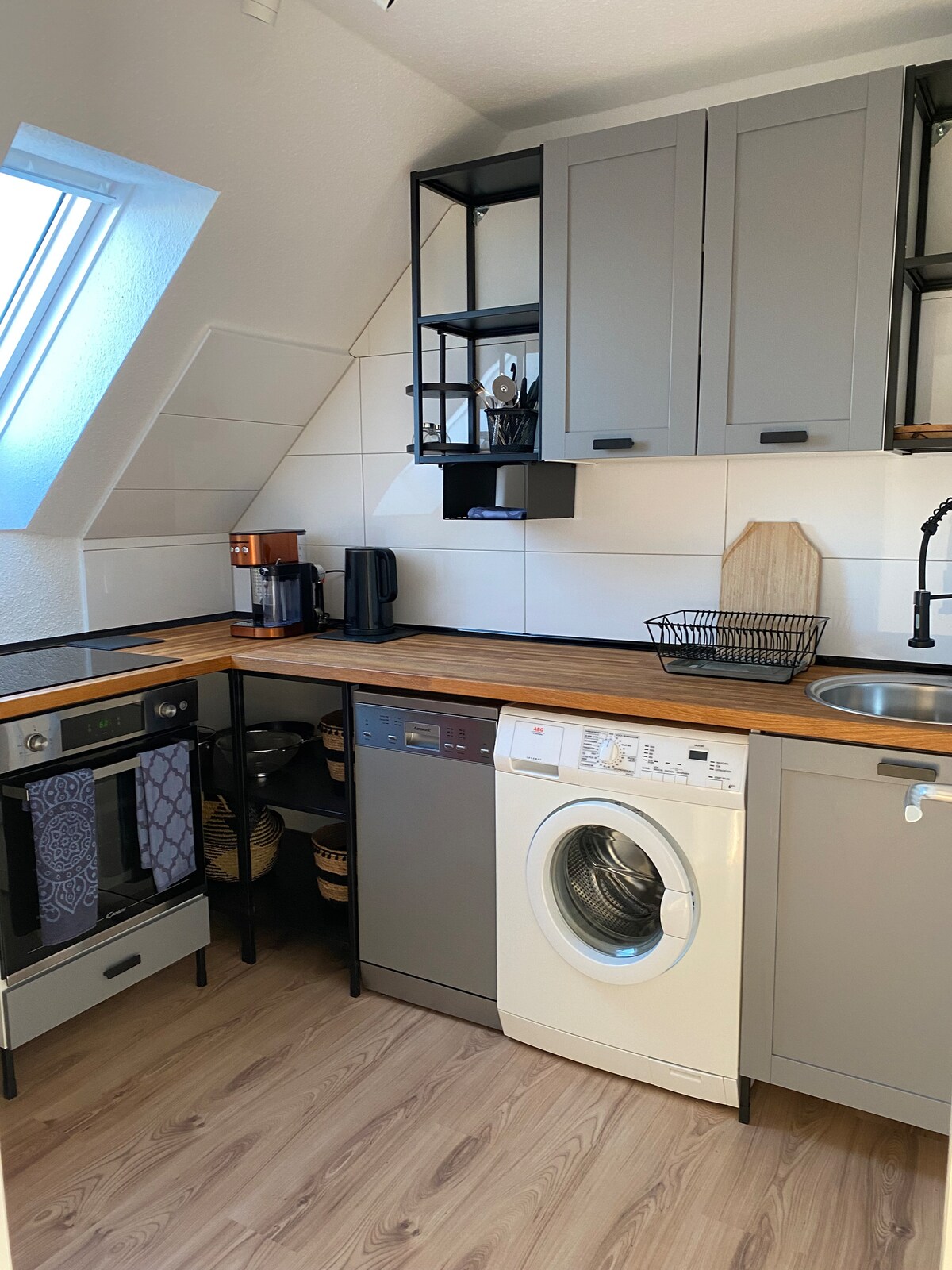 Welcome to our cozy, modern private attic apartment/suite. You will stay on a fully private floor with a combined sleeping and living area, as well as a modern bathroom with a separate shower. Free parking 3 minute walk next to Opladen Bahnhof. Just a 3-minute walk to Opladen train station and about 16 minutes by RB train to Cologne Central Station. There is no kitchen. A microwave, coffee maker, and mini fridge are provided.