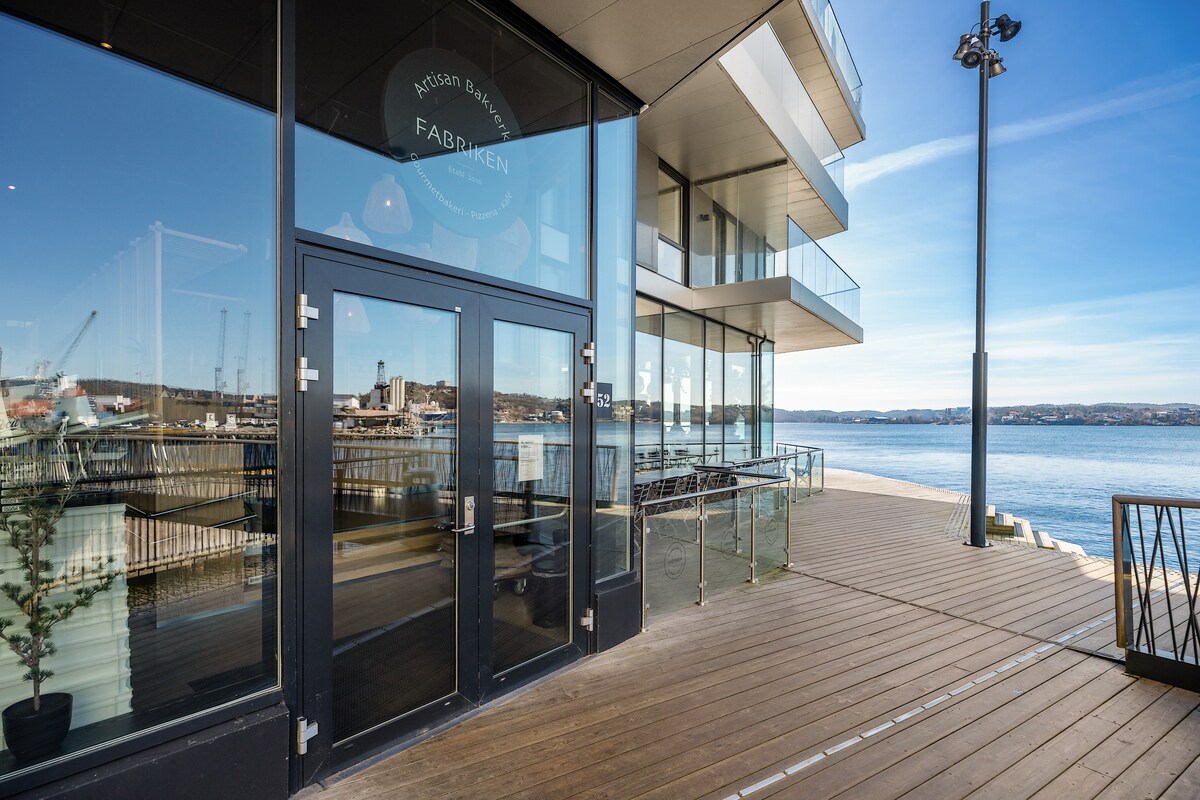 Odsjednite u potpuno novom i modernom stanu tik uz more – sa velikim osunčanim balkonom i pogledom na gradski fjord. Sve je uključeno: posteljina, peškiri, kafa, sapun i još mnogo toga. Stan ima potpuno opremljenu kuhinju, udoban dnevni boravak sa sofom na razvlačenje, delikatno kupatilo i jednu prostranu spavaću sobu. Savršeno za opuštajući boravak uz hotelski osjećaj - usred prelijepog i centralnog Kristijansanda. Parking u objektima dostupan za samo 100 NOK/dan