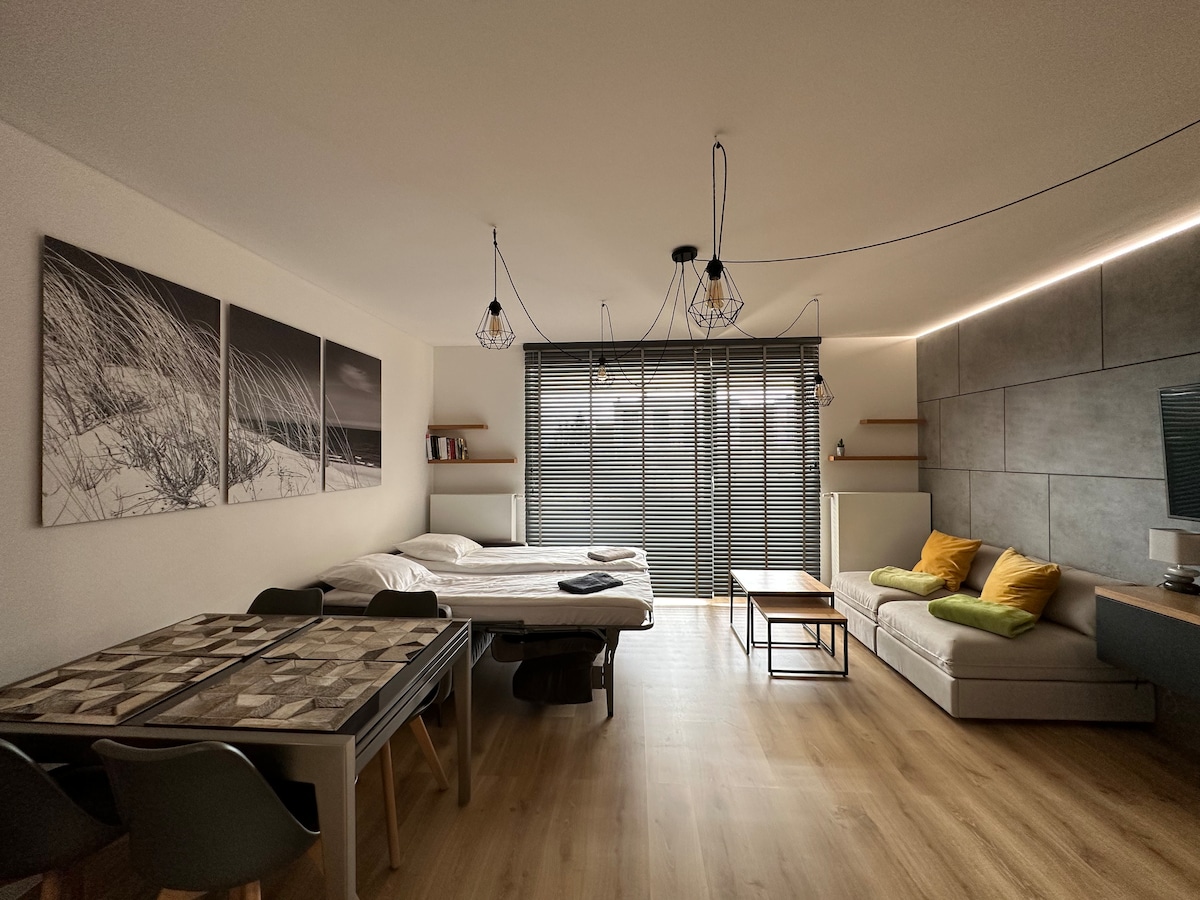 Elegantan, moderan stan u novoizgrađenoj stambenoj zgradi Baltic Marina Residence namijenjenoj za 4 osobe. Oko 41 m2 uključuje spavaću sobu koja se može zaključati sa bračnim krevetom dimenzija 160x200 cm, dnevni boravak sa sofom na razvlačenje, trpezariju, potpuno opremljenu čajnu kuhinju i kupatilo sa tušem. Stan ima izlaz na balkon.