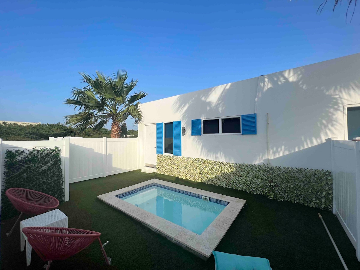 Ušuškana u raju, naša luksuzna kućica je vaš odmor iz snova, osmišljen za usporavanje u potpunoj privatnosti, nudeći vam osjećaj tropskog doma. Uronite u ostrvski način života i uživajte u vrhunskoj oazi na otvorenom, sa privatnim bazenom i udobnim unutrašnjim dvorištem. Roštilj i spoljni tuš doprinose toj blaženoj atmosferi odmora. Udaljeni smo samo 10 minuta od poznatih plaža na Arubi. A kada se dan smiri, utonite u luksuzni krevet jer zaslužujete samo najbolje!