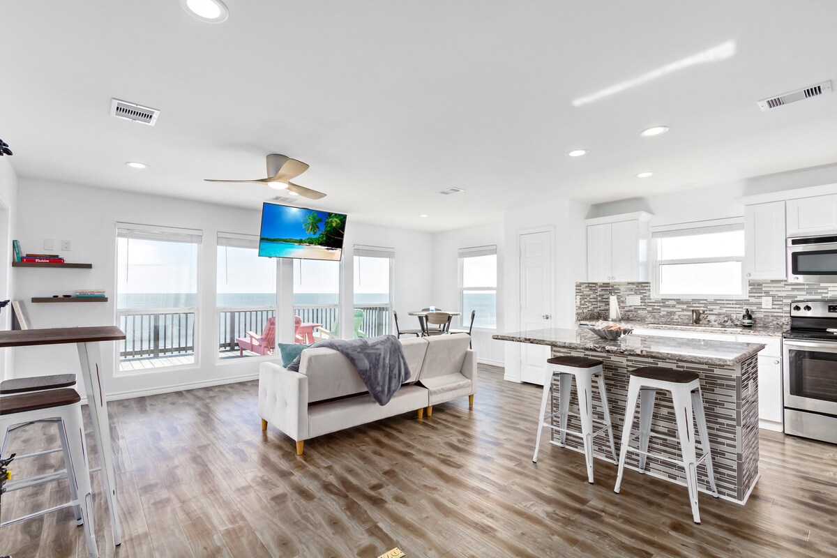 Uz plažu s panoramskim pogledom na okean, kućnim bioskopom, hidromasažnom kadom i ognjištem. Obje spavaće sobe imaju pogled na plažu s bračnim krevetima, televizorima od 65inča i privatnim kupatilima. Dnevni boravak ima TV od85inča, surround zvuk i brzi internet za filmove/igre. Dizajniran kao dvospratni dupleks sa odvojenim ulazima, terasama, klima-uređajem i zvučnom izolacijom, Airbnb je 1. sprat od 1000 kvadratnih stopa. Drugi sprat je za vlasnike koji često putuju i nikada se ne iznajmljuje. Ako su prisutni, obično su nevidljivi. Dostupno je punjenje električnih vozila.