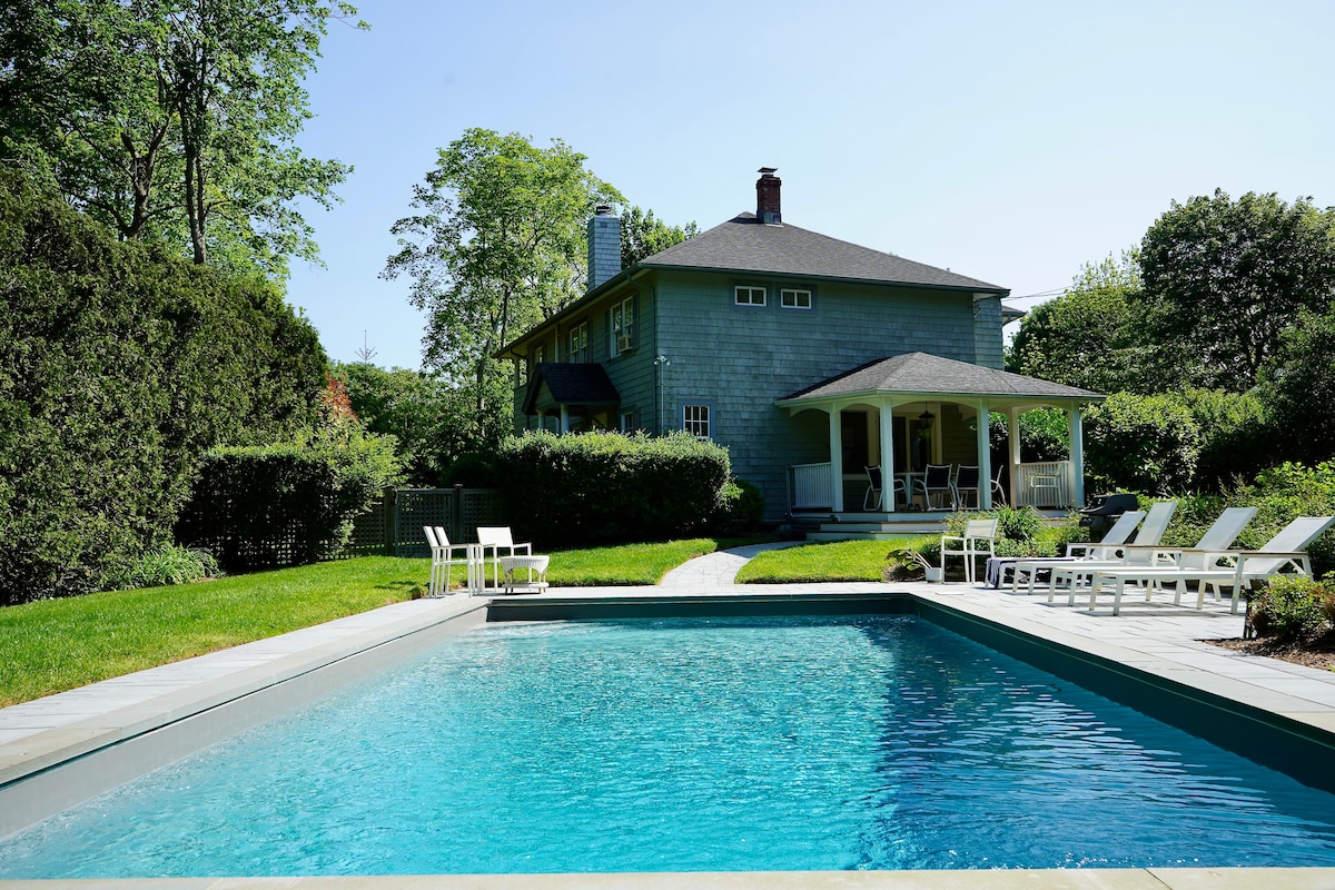 Escape to your private, serene, Hamptons oasis! Just 1 block to the water + 8 mins to Main Street. Enjoy your large pool, BBQ, fire-pit, Chef's kitchen and chic decor throughout the home. Curl up to the wood burning fireplace + 80' streaming TV. The perfect place to relax, make memories + gather. You'll be 1 block to the best waterfront dining in the area + waterfront cafe. Stroll to grab coffee, cocktails + dinner with the best sunsets. You'll be 8 mins to beaches, Main St., shopping + more!