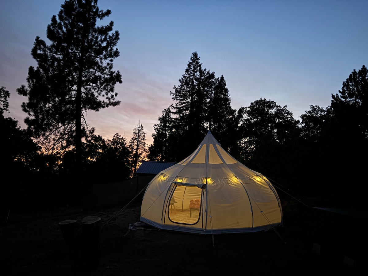 Uživajte u boravku u ovom prostranom šatoru sa nekim od udobnosti doma. Ovaj šator je treći u našem malom kampu. Ima bračne krevete, noćni ormarić, jastuke, posteljinu, peškire za kupanje, pribor za kuvanje, fenjere, ognjište, roštilj na gas, veliki sto i vodu za piće. Imamo jedan toalet u trezoru, unutrašnji i spoljašnji tuš koji se dijeli sa drugim kampovima. Na raspolaganju vam je i restoran i prodavnica slatkiša/sladoleda. Udaljeni smo 4,5 milja od nacionalnog parka Sekvoja.