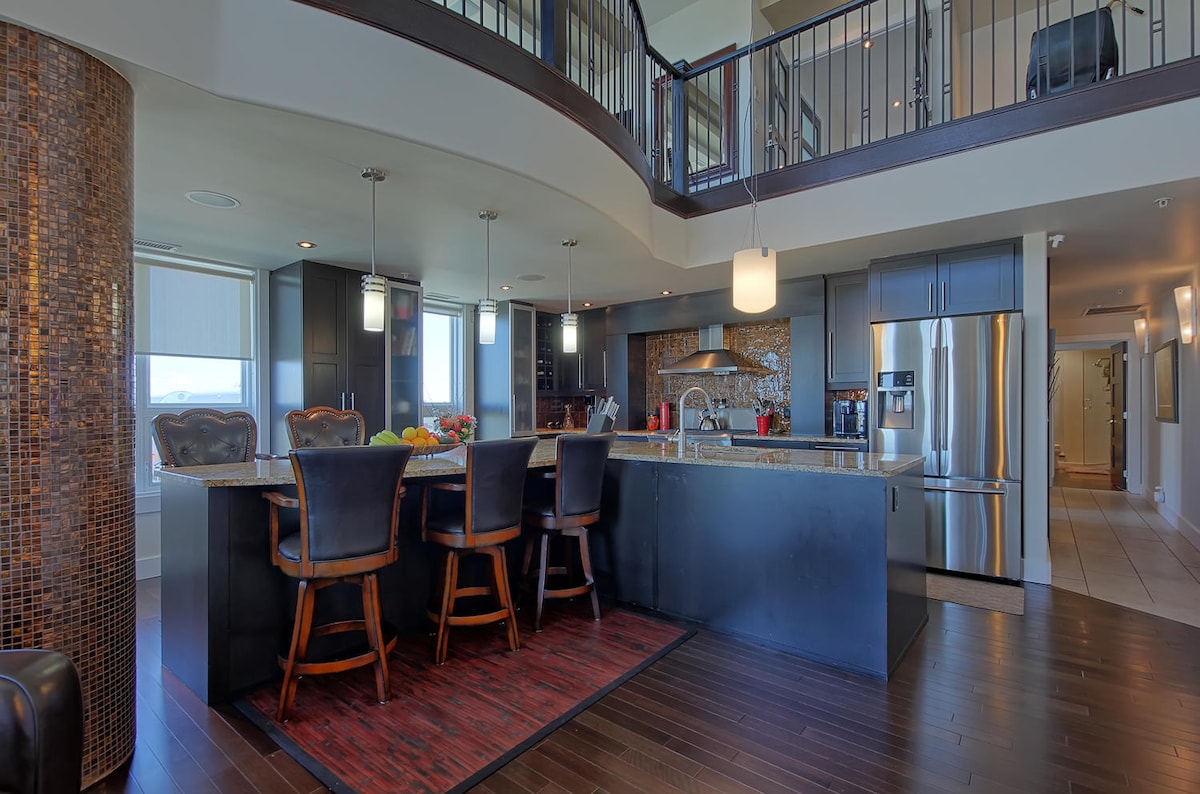 Ovo jedinstveno potkrovlje nalazi se u srcu centra Edmontona, u blizini Rodžers Plejsa, Granta MekEvana, UofA, River Velija, pijace, LRT-a i restorana u izobilju. Potkrovlje ima otvoreni koncept s visokim plafonima, zakrivljenim arhitektonskim dizajnom koji vam pruža savršen pogled na centar grada. Prilagođena kuhinja, sauna, TERETANA, klima-uređaj, spa centar u sklopu apartmana sa tuš-kabinom i kadom za kupanje. Dodatni elementi uključuju bračni krevet i bračni krevet, vešeraj u apartmanu, UG parking (mali automobili i terenci), aparat za kafu, kamin itd.