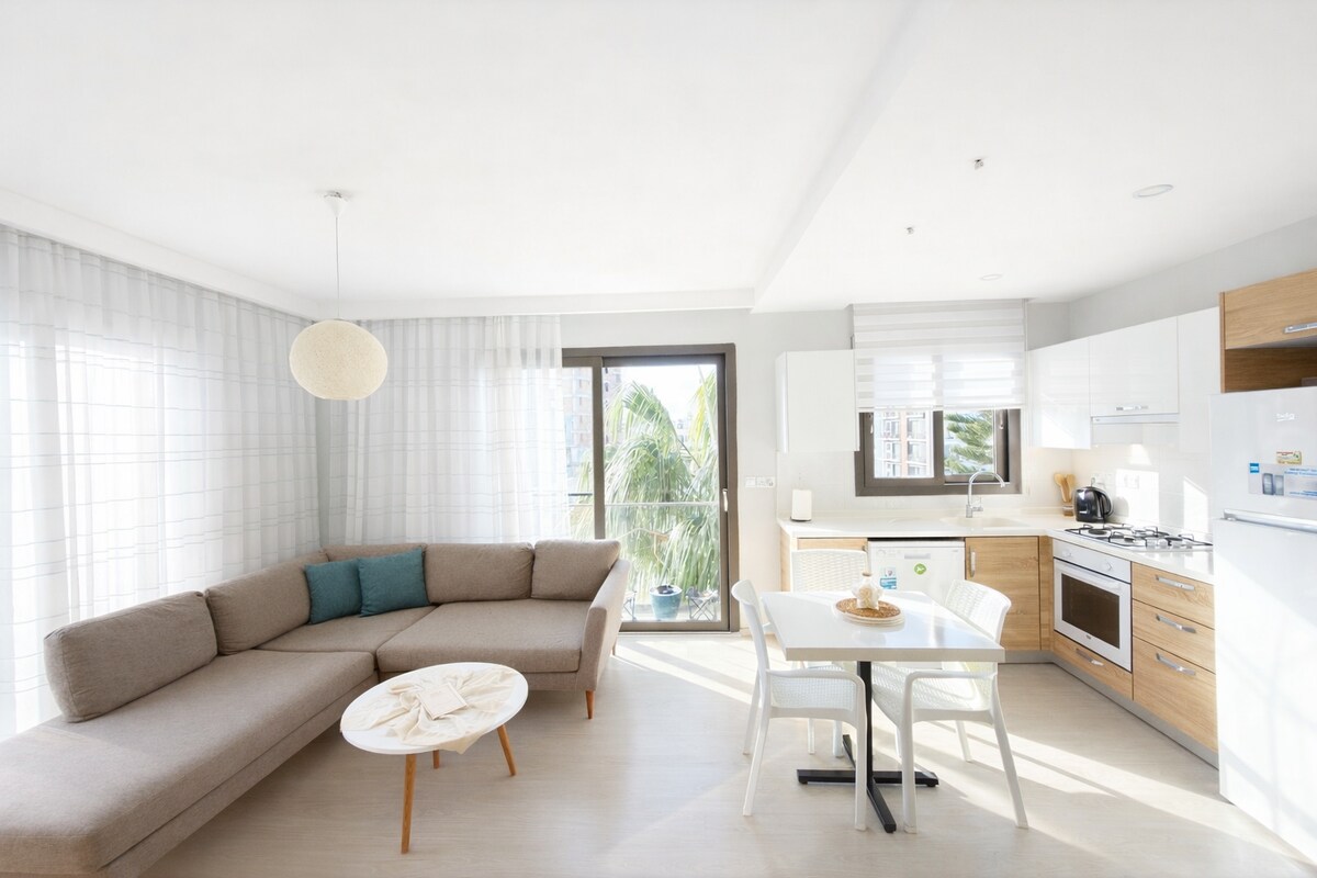 You will like very much experiencing this modern, stylish, well-equipped, well furnished, always fully clean and very tasteful 1 bedroom flat in a perfect spot with total energy and happiness. Comfort and delight are at focus. The location is perfect, only 1 minute walk to main road and buses to Girne. Sandy beach, Merit Hotel Casino, market are at 2 min. walk, supermarket at 10 min., big market at 4 min. walk, fishery at 1 min. Kyrenia is only a few minutes by car. Welcome Meal set with Wine.