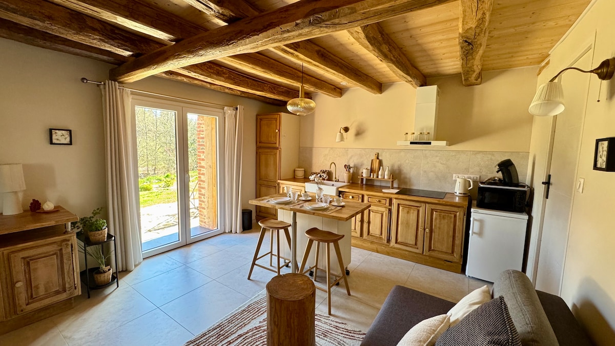 Enjoy a unique escape in the heart of our racehorse training center, with stunning views of the Chaîne des Puys. This 50 sqm cocoon, fully renovated in 2023, blends charm and comfort: queen-size bed, single bed on the mezzanine, and a high-end sofa bed. Access to the mezzanine via a ladder-style staircase (see photos). Peaceful, natural setting for true relaxation. Parties are not allowed to preserve the calm atmosphere and the horses’ well-being.