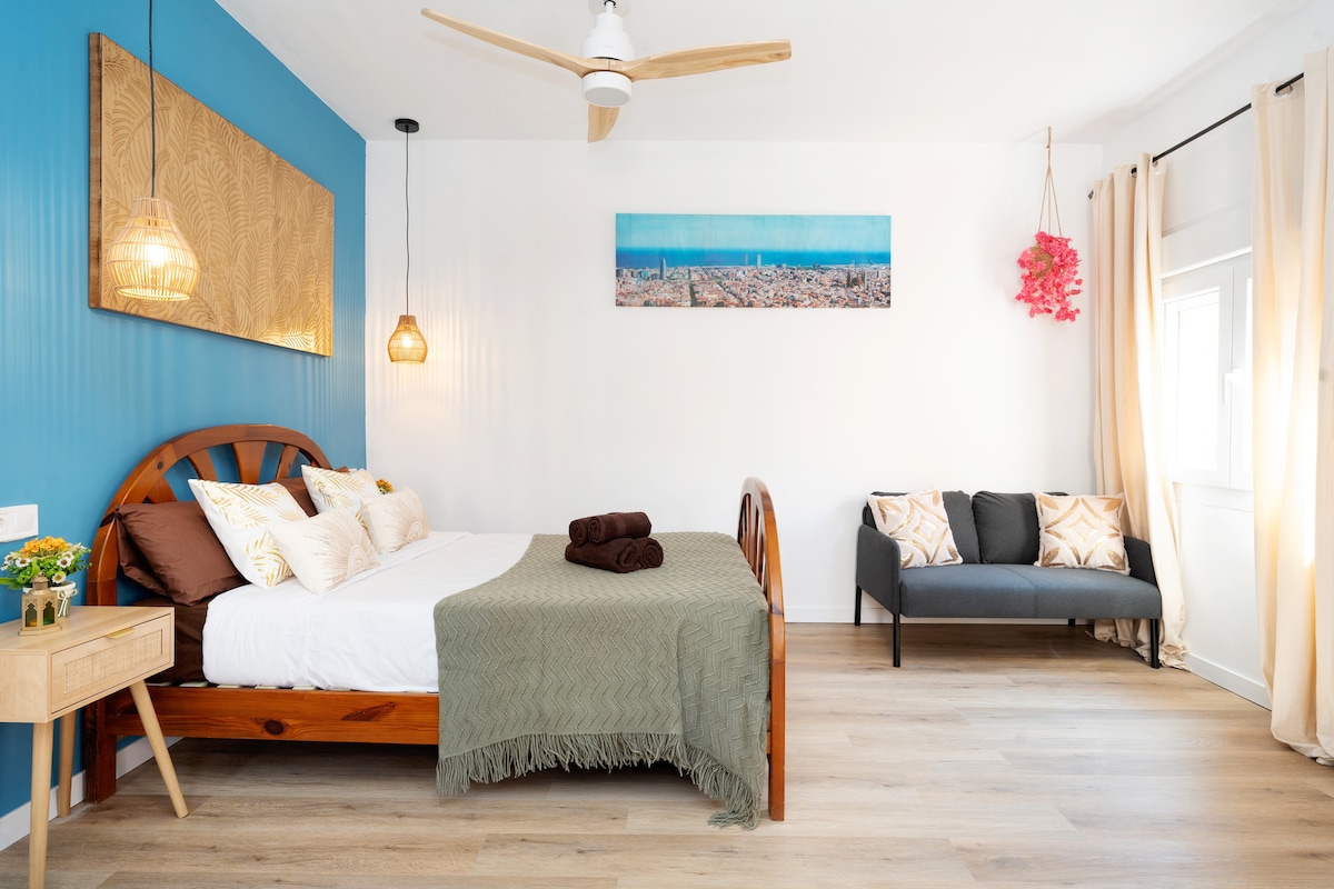 Bonito y luminoso estudio independiente, recién reformado, ideal para 2 personas. Dispone de cómoda cama matrimonial, baño completo y cocina totalmente equipada, a pocos minutos a pie de la playa y a unos 15–20 minutos en tren del centro de Barcelona (Plaça Catalunya). SEGUNDA PLANTA SIN ASCENSOR Aire acondicionado, Wi‑Fi, secador pelo, plancha, TV, Microondas, tostadora y todo lo necesario para una estancia cómoda y funcional Tasas turísticas 1,65 €/persona/noche no incluidas en precio